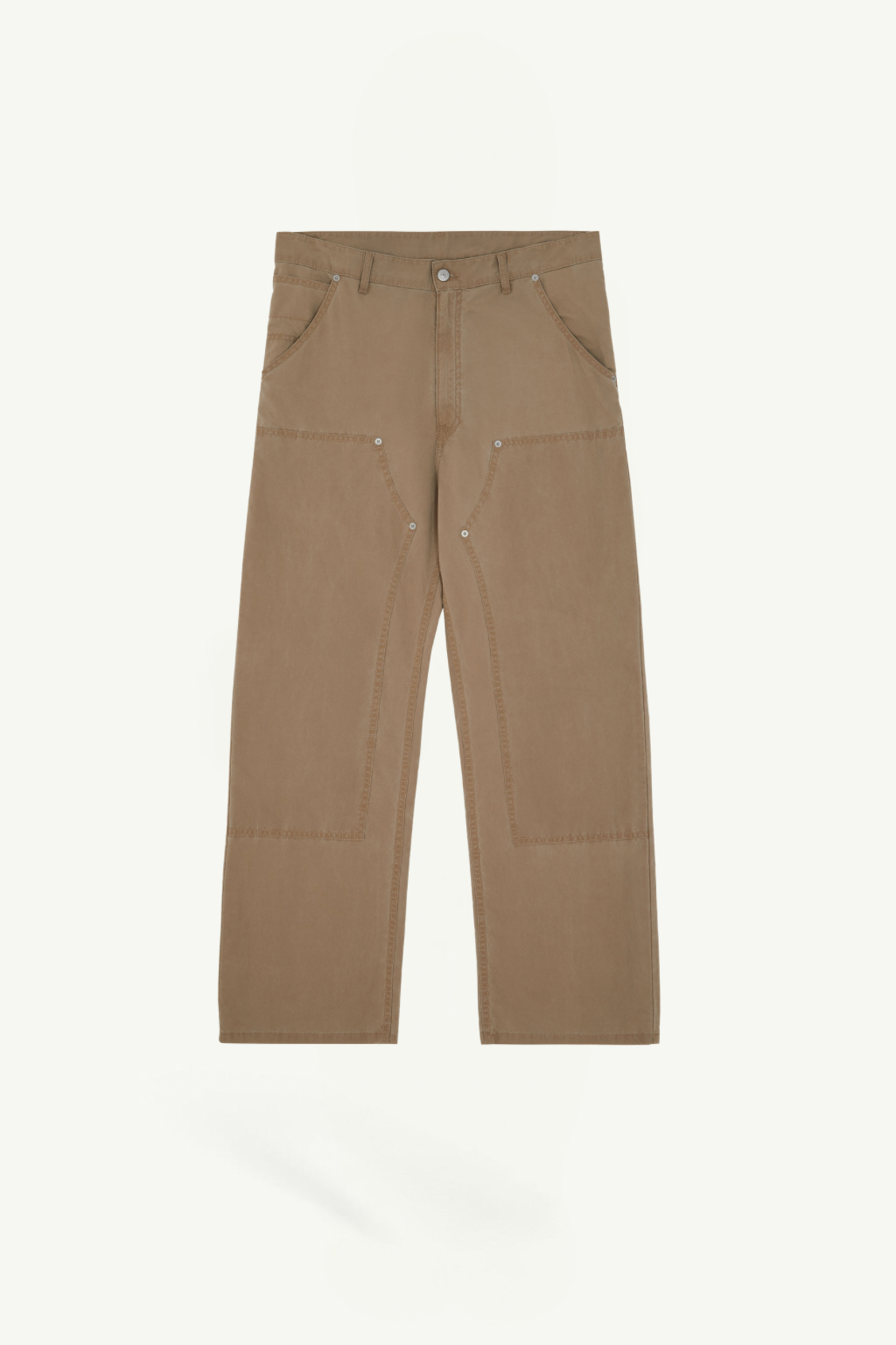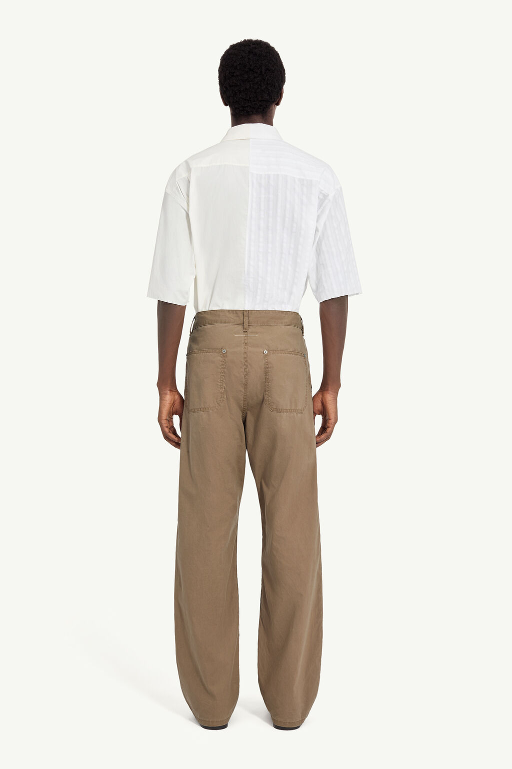 These washed cotton trousers are defined by reinforced knee panels, curved seamwork and riveted detailing. A relaxed construction that reframes utility, finished with the Maison’s horizontal line of white stitches at the back.