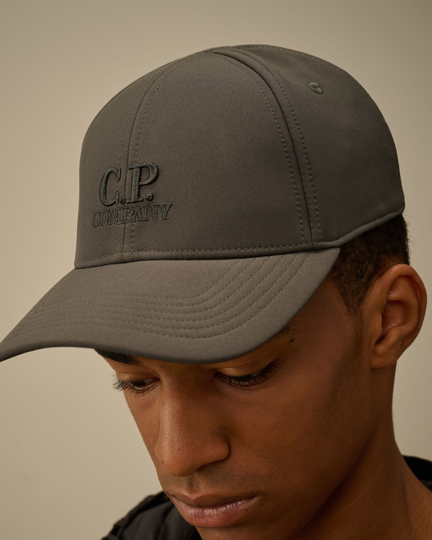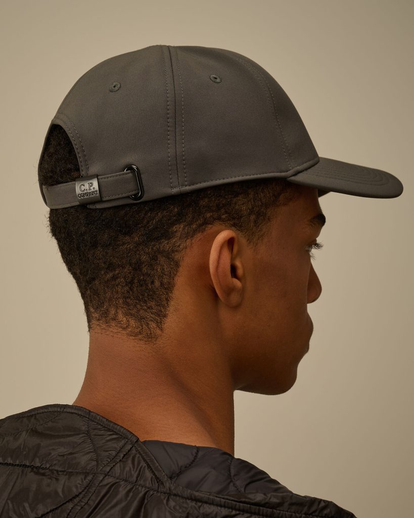 Cap crafted in C.P. Shell-R, a recycled multifilament 3-layer softshell stretch, made from recycled Polyester yarn. Global Recycled Standard certified (GRS). Bonded for water column of 5000mm. The cap features a curved brim, a panelled construction, an adjustable closure, and an embroidered logo detail.