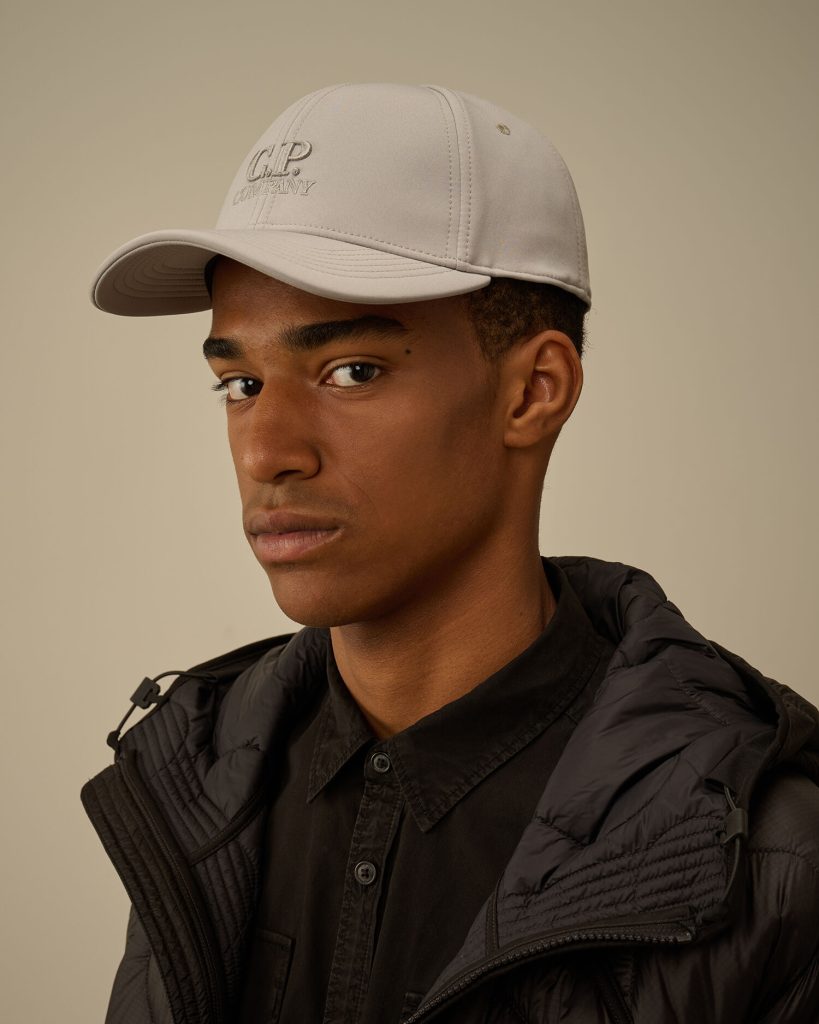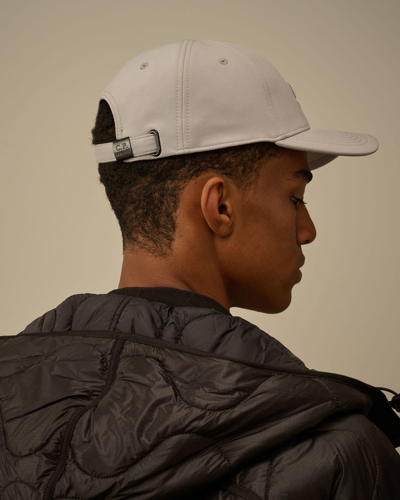 Cap crafted in C.P. Shell-R, a recycled multifilament 3-layer softshell stretch, made from recycled Polyester yarn. Global Recycled Standard certified (GRS). Bonded for water column of 5000mm. The cap features a curved brim, a panelled construction, an adjustable closure, and an embroidered logo detail.