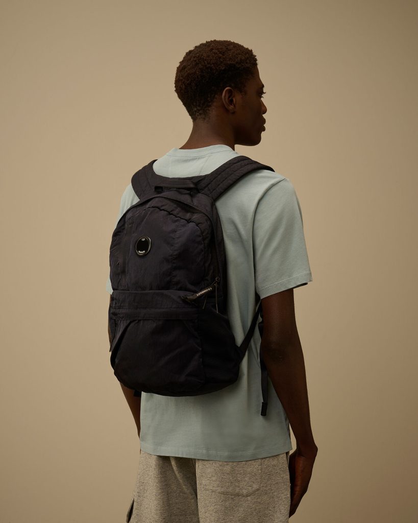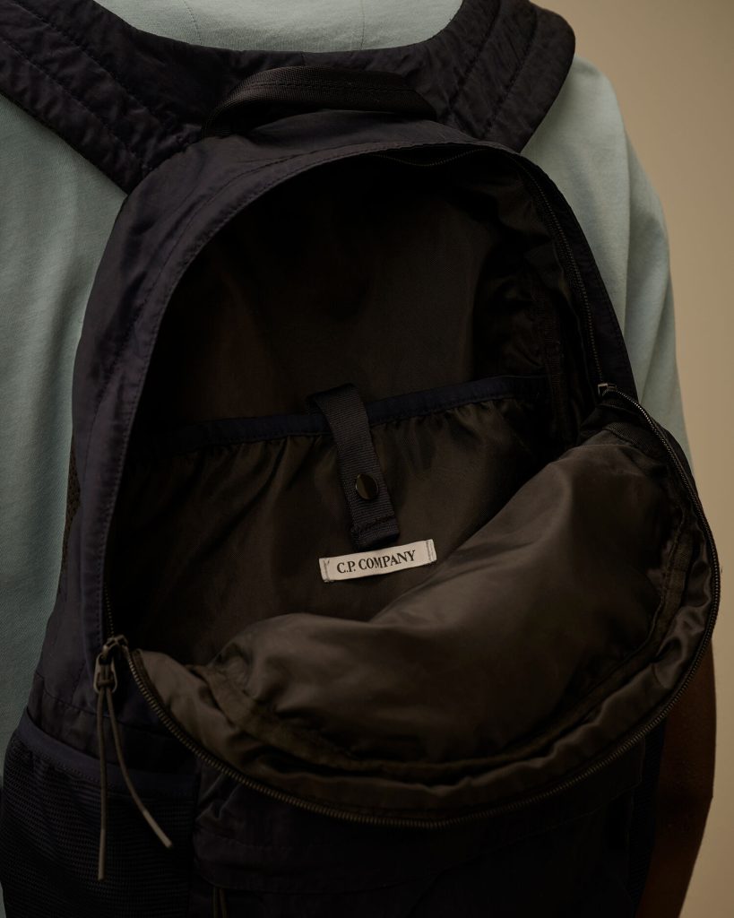 Backpack crafted from Nylon B, a military-inspired satin nylon multifilament fabric known for its durability and smooth texture. The model features adjustable straps with buckle closure, padded shoulder straps, and a carry handle. Functional details include multiple zip pockets, an embroidered logo, and an inner snap pocket with logo detail. Garment dyed to achieve unique colour depth and tonal variations that evolve with time and wear. Anti-drop treated.
