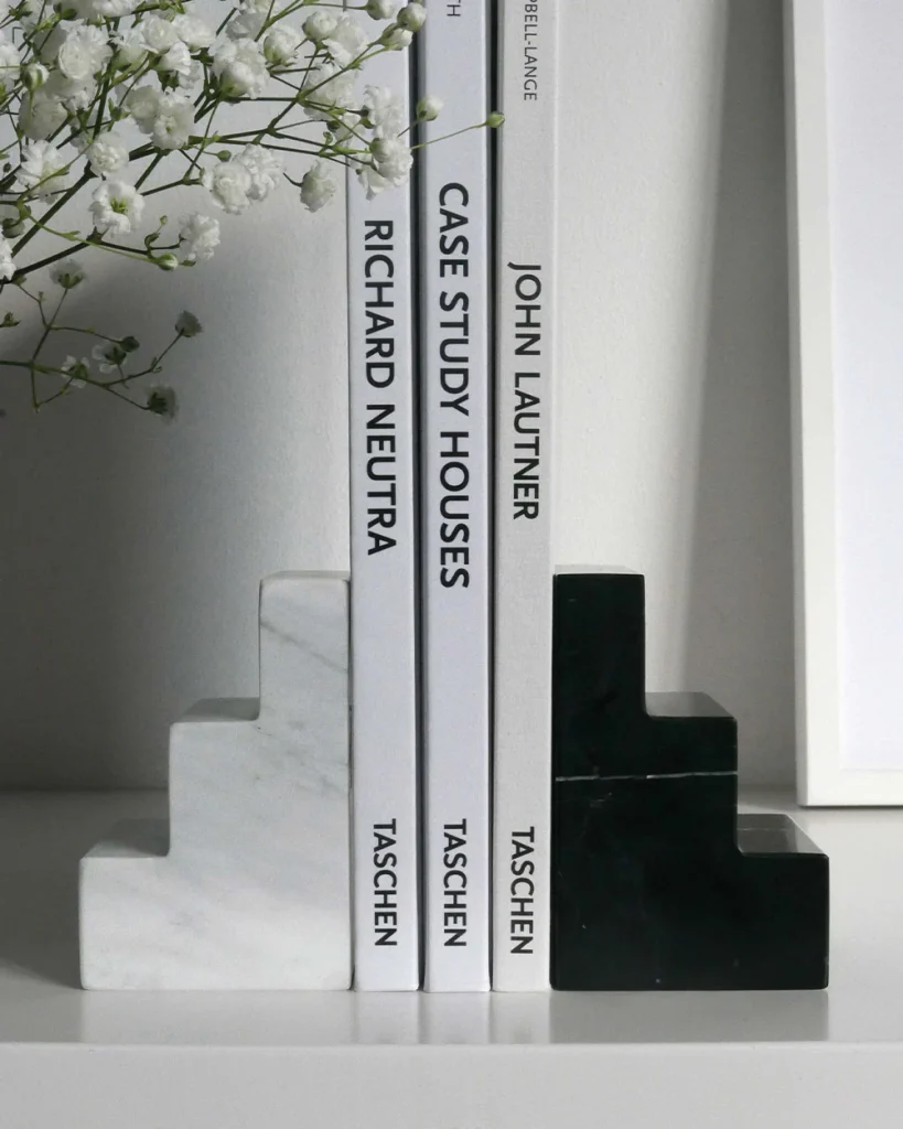 Elevate your home decor with our Stair Cube Bookends, crafted from a blend of black and white marble. These natural stone bookends not only maintain the order of your books but also serve as captivating decorative pieces. With unique variations due to their cuts from different stone parts, each pair is a masterpiece celebrating the beauty of nature.