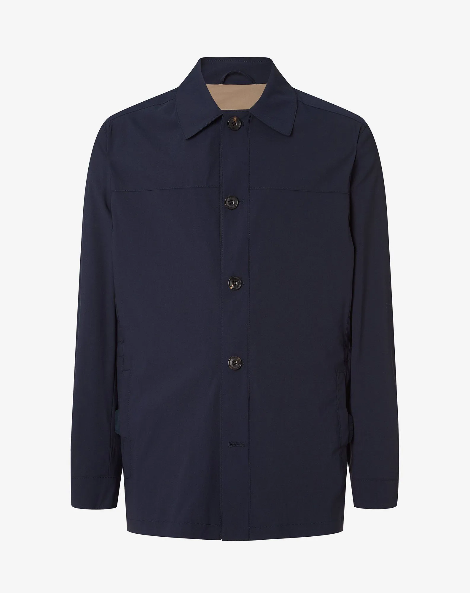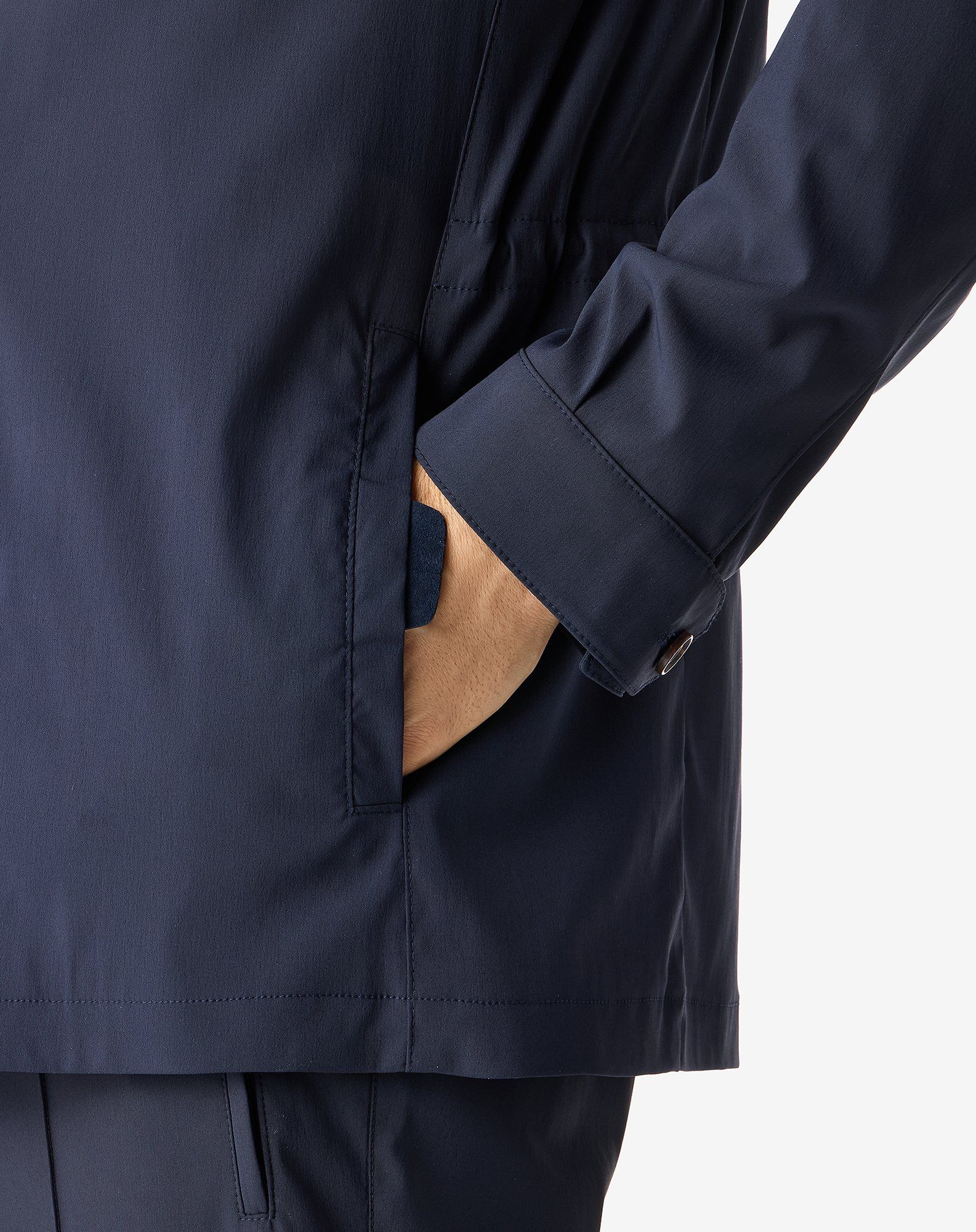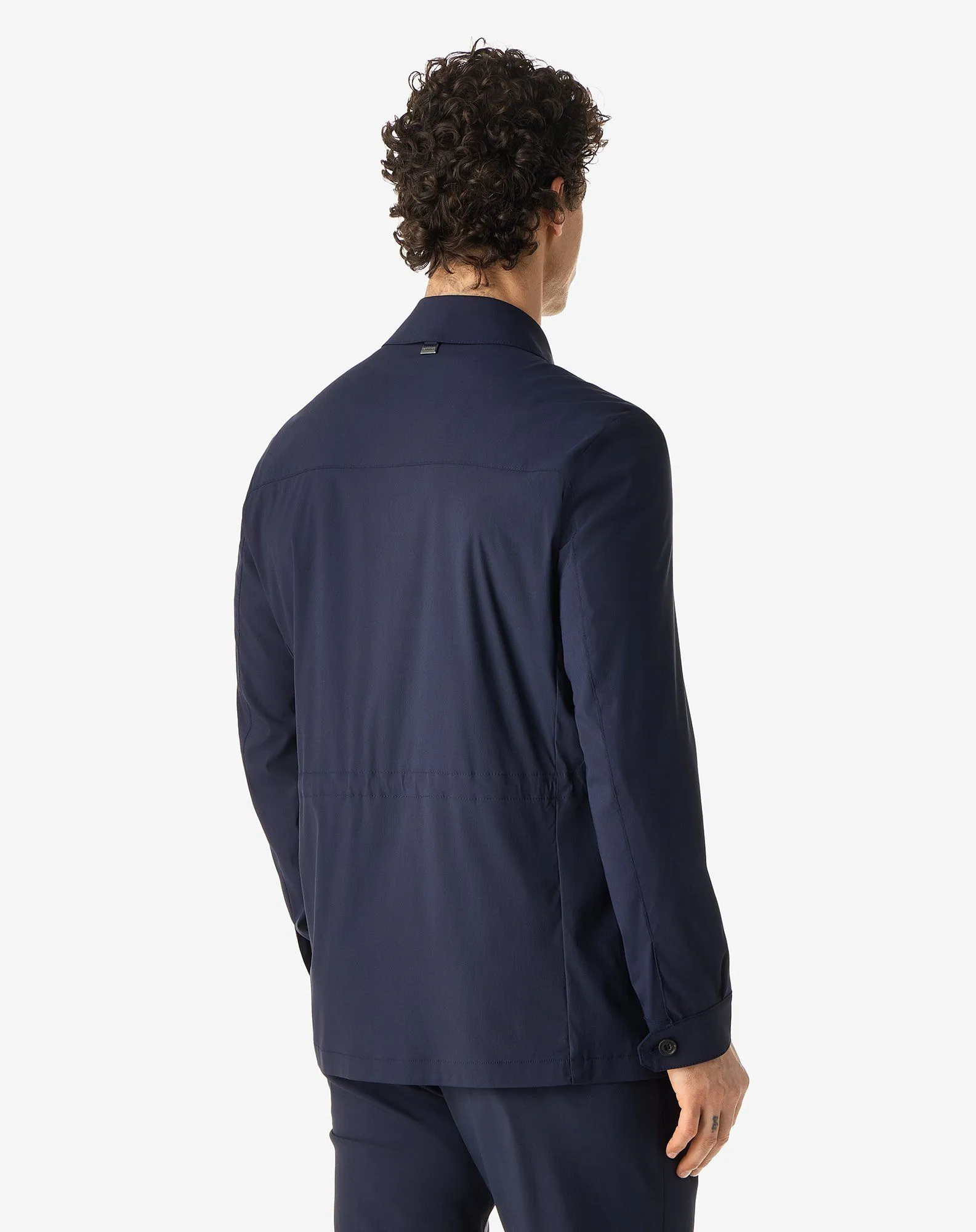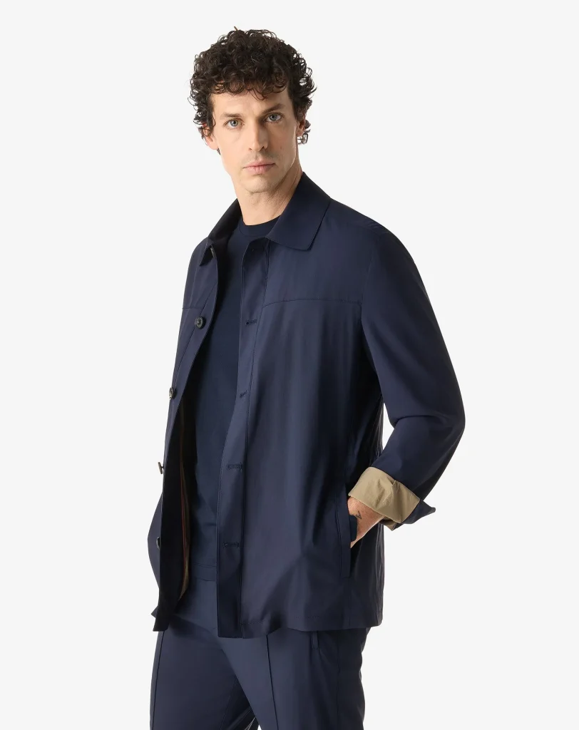 This blue stretch technical wool field jacket makes an everyday outerwear with a balance between comfort and rigour. The semi-lined construction and shirt collar accompany a neat line, completed by front button fastening. The welt pockets with leather detailing provide an understated finish, while the 76 cm length ensures harmonious proportions