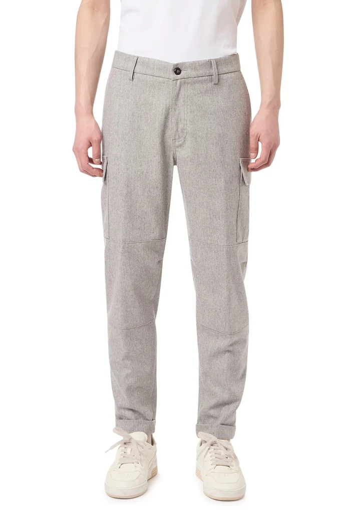 Cargo trousers in wool and cashmere with large side pockets. The garment is further elevated with intricate sartorial stitches.