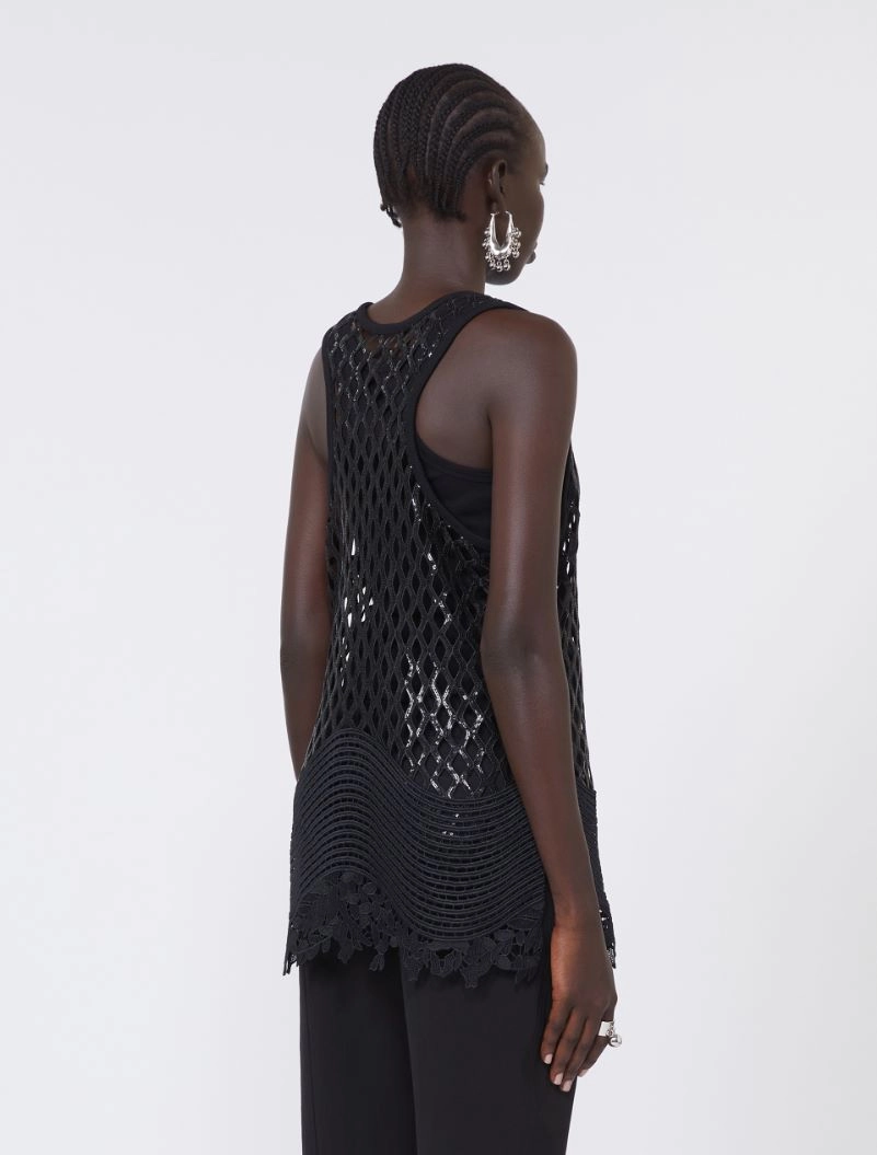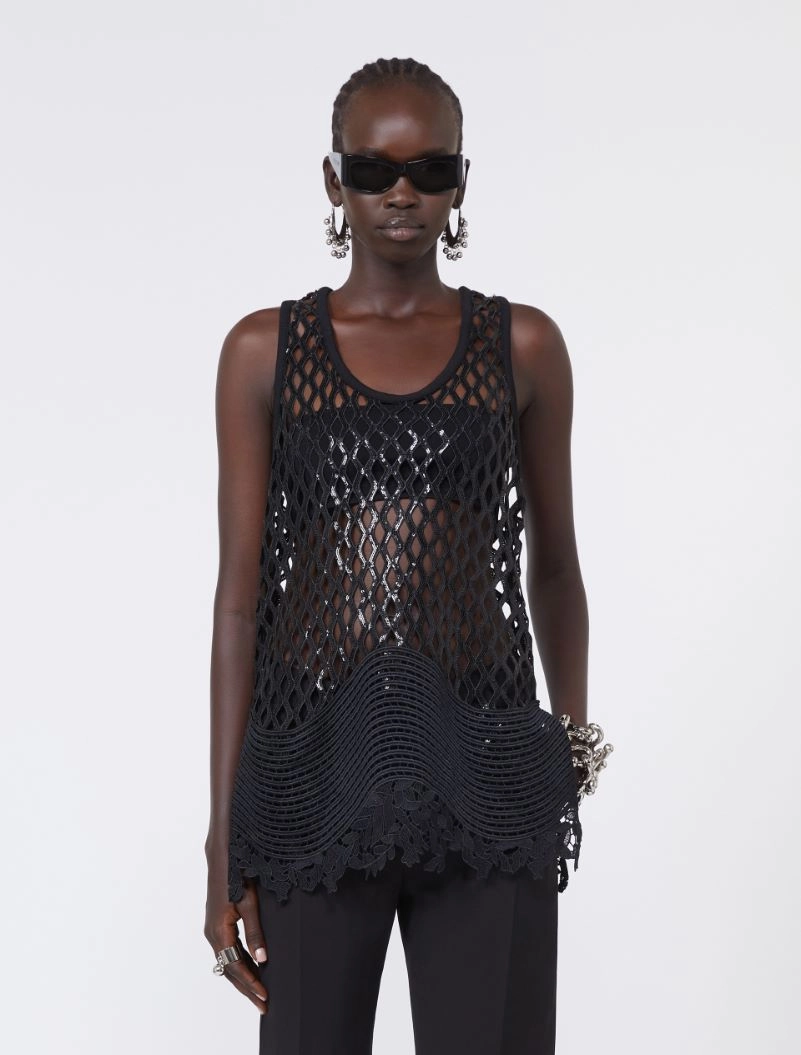 Straight-fit sleeveless top in sequinned mesh fabric. The garment features a racerback line with a rounded front neck, and a matching-tone macramé edge with a scalloped hem that follows the pattern. Lined with a ribbed vest. Side slits.
