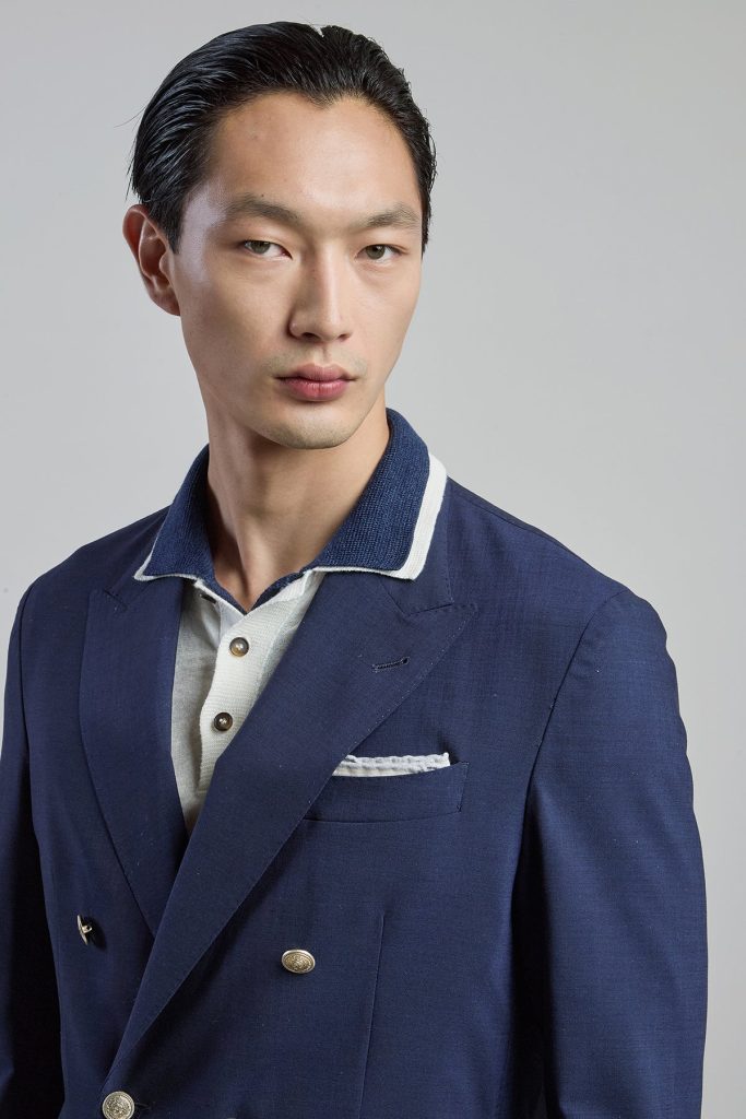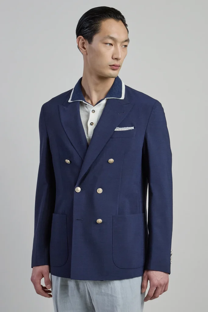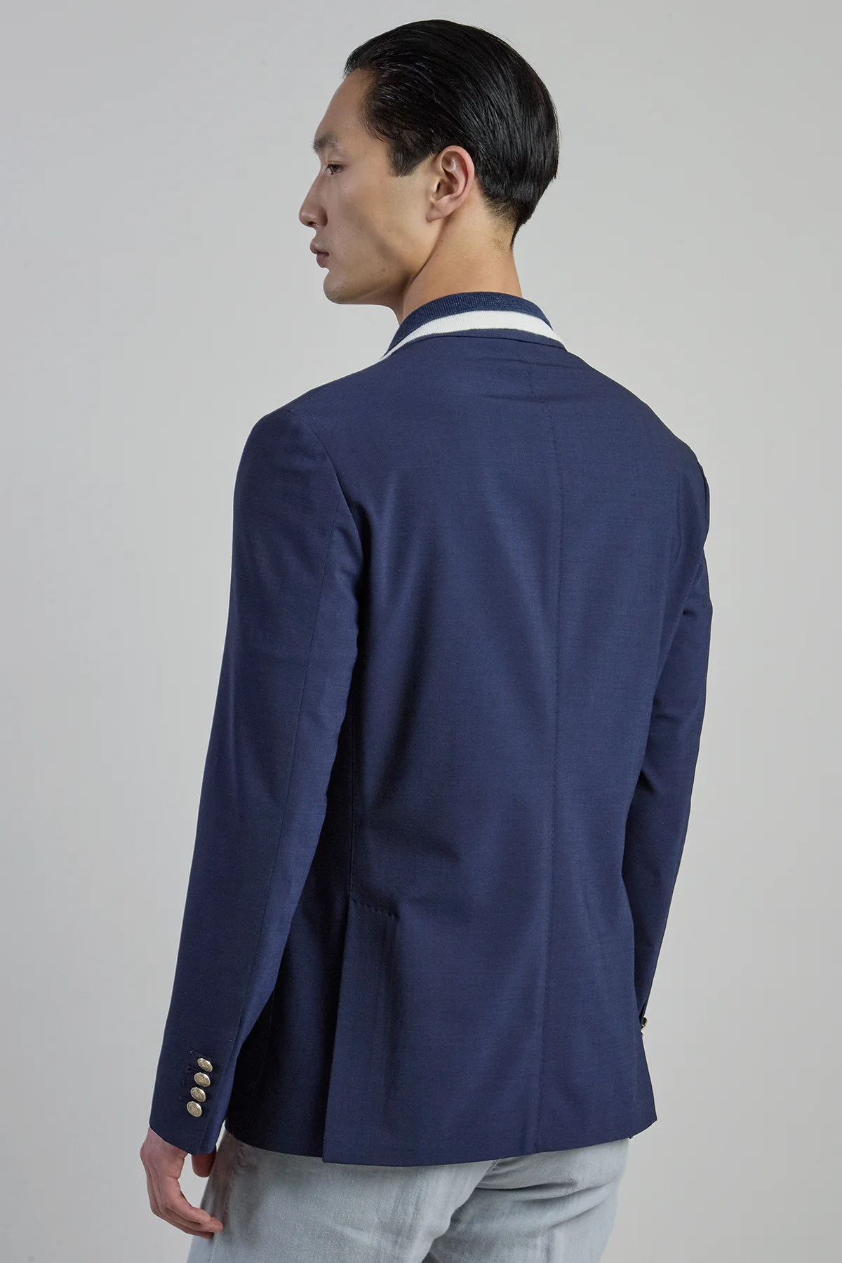 Dynamic movement and sartorial precision define this double-breasted jacket crafted from premium bi-stretch wool. Engineered for the modern man, the virgin wool blend provides a comfortable regular fit that moves with the body while maintaining its structured shape. Featuring classic peak lapels and functional patch pockets, this tailored blazer offers a sophisticated balance between traditional elegance and casual ease. The high-quality Italian craftsmanship ensures a refined finish, making it a versatile staple for professional settings or upscale social events. Its crease-resistant properties and breathable texture make this wool outerwear an essential piece for a polished and functional seasonal wardrobe.
