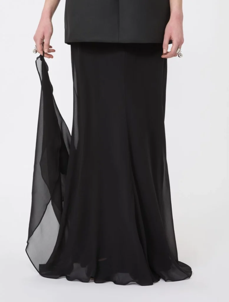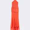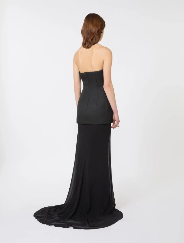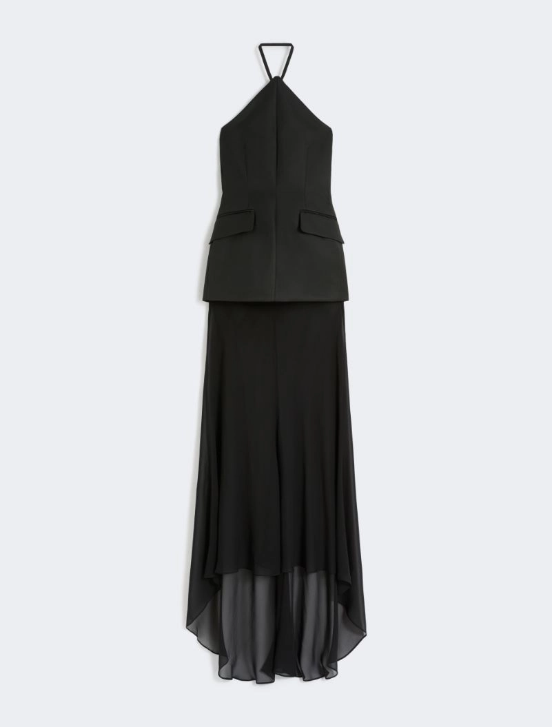 Designed for the most glamorous evenings, this dress features an hourglass bodice with a halter neckline and a flared georgette skirt with a train and eyelet so you can hold it in your hand.
