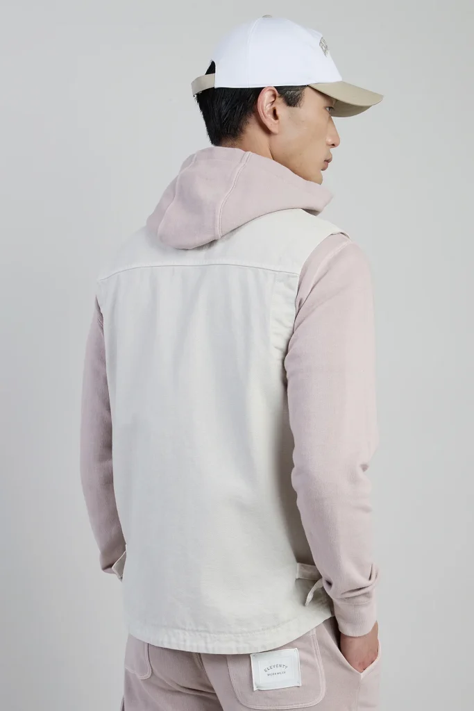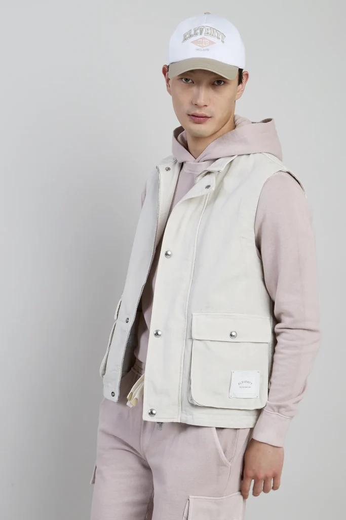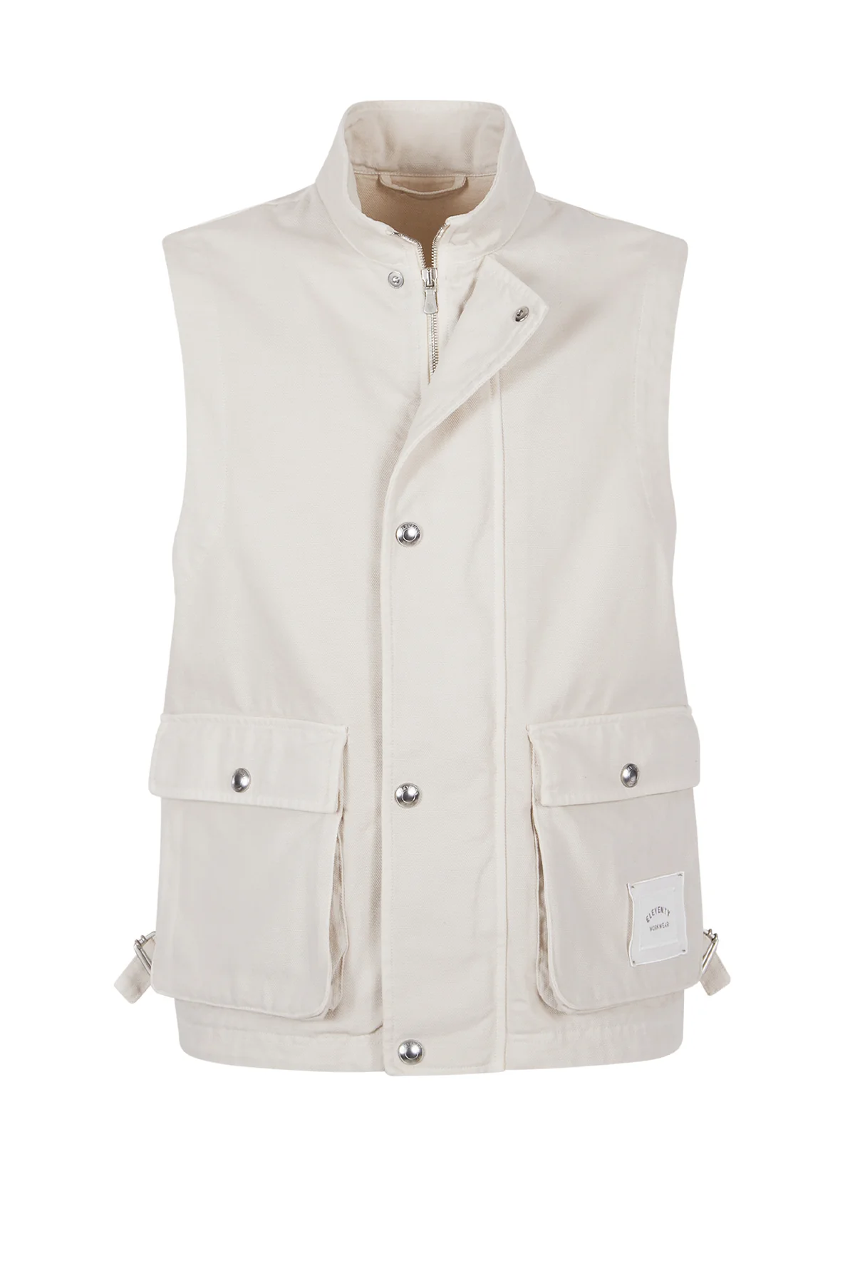 Rugged workwear influences meet the breathable quality of pure cotton in this garment-dyed vest designed for a modern wardrobe. Crafted from 100% cotton, this regular fit piece is characterized by a specialized dyeing process that enhances color depth near the seams for a distinctive worn-in look. The functional design features spacious patch pockets and adjustable side frog closures with metallic hardware to customize the silhouette. This sleeveless outerwear option offers a balanced mix of utility and refined aesthetics. Ideal for transitional layering, the cotton waistcoat ensures durability and a soft feel, making it a versatile essential for the Spring Summer season