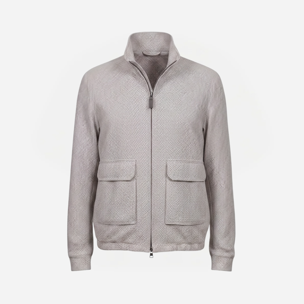 Bomber jacket crafted from a linen-cotton blend with frisé-patterned yarns that give the fabric unique aesthetic and functional properties. The classic pied de poule motif features a modern and versatile three-dimensional look.