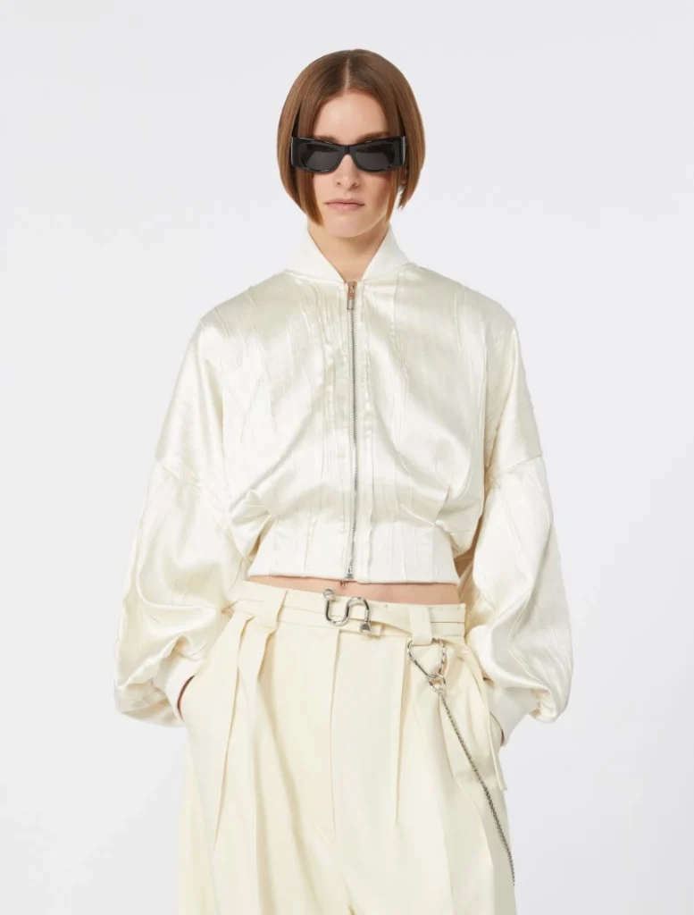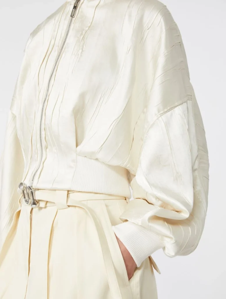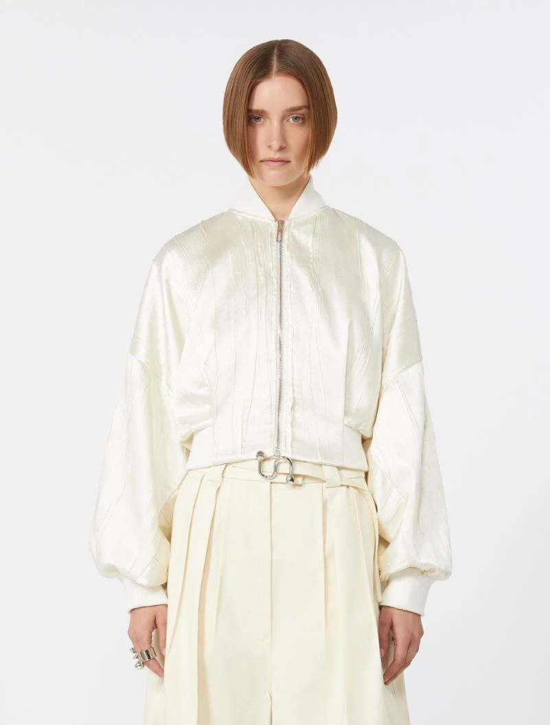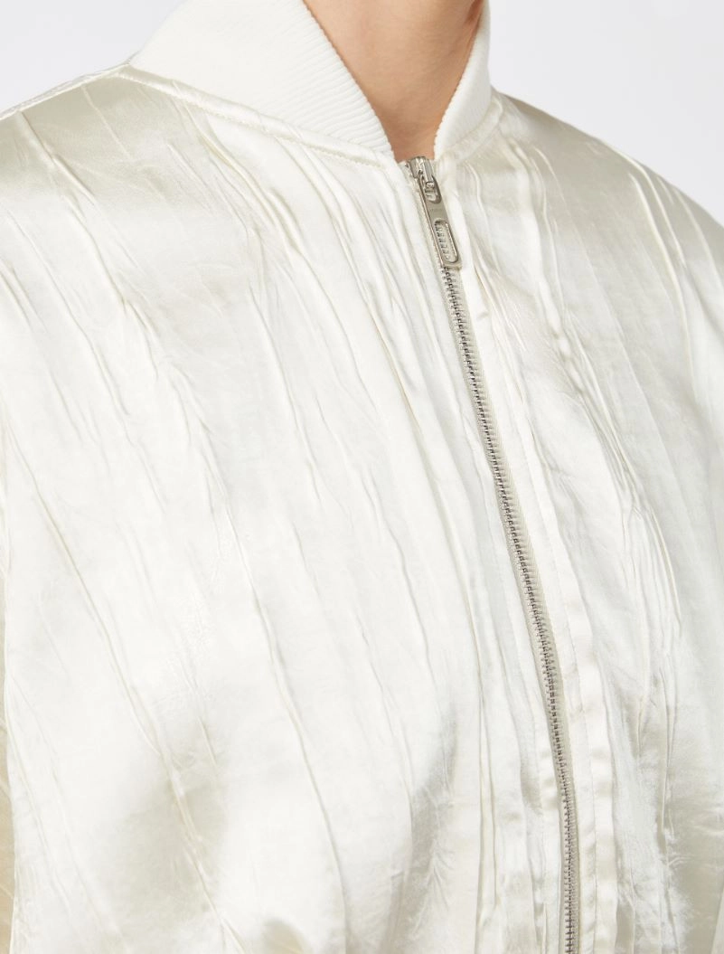 Lined bomber jacket in plissé-pleated bonded satin fabric