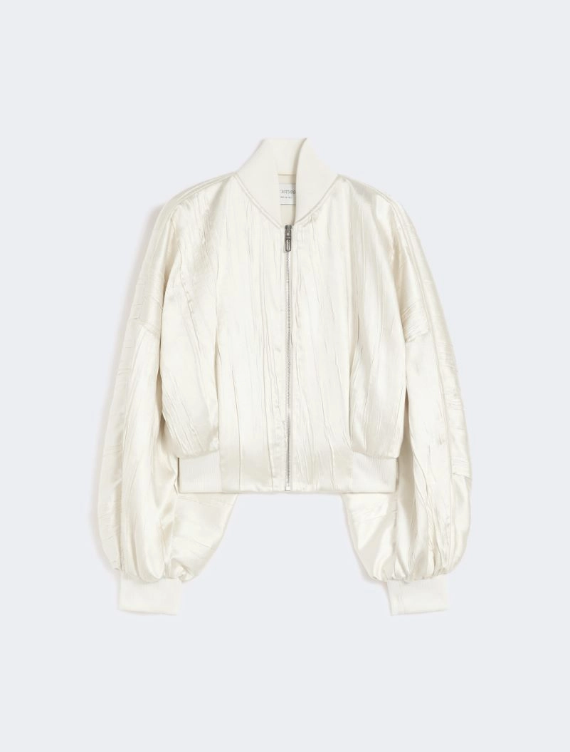New bomber jacket in plissé-pleated bonded satin fabric featuring an oversized fit and classic casual model-inspired details. Fine rib-knit details on the neck and trims. The back features a kimono seam and pleats at the hem that create a bloused effect.