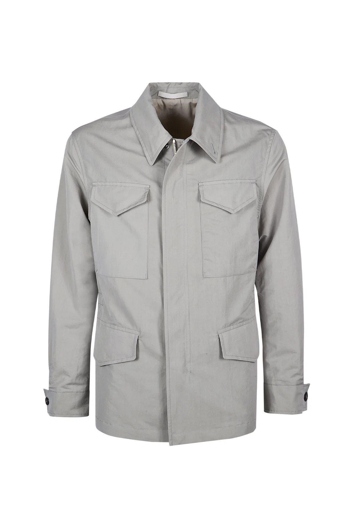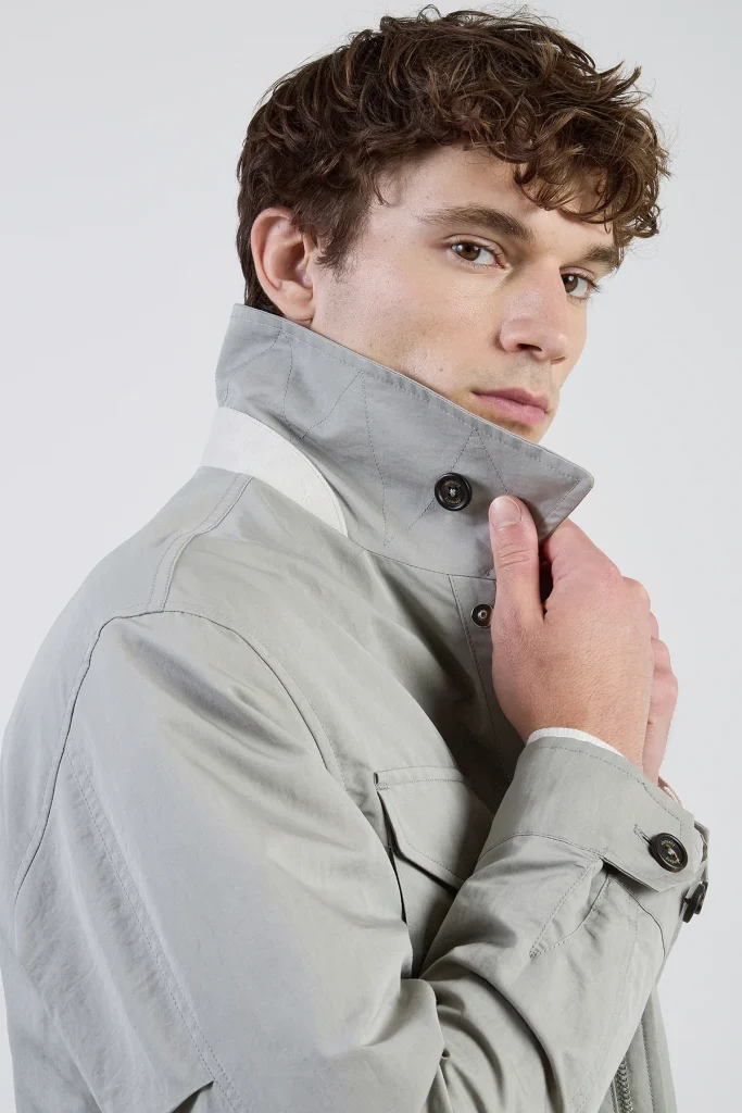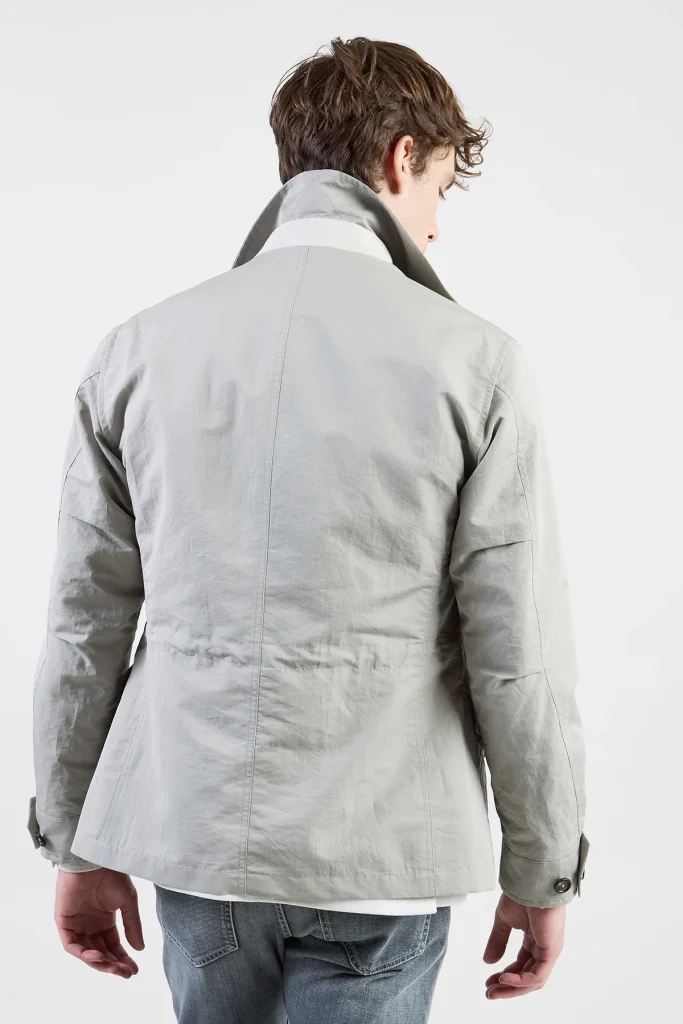 Premium cotton and silk fibers define the texture of this men’s safari jacket, a versatile spring outerwear piece with a sporty yet polished character. The lightweight fabric construction features concealed snap buttons to maintain a clean and minimalist silhouette. Refined velvety suede accents add a tactile dimension to the garment, highlighting the attention to detail. Designed with a regular fit, this field jacket provides ease of movement and a comfortable feel for daily wear. Expertly crafted through Italian tailoring, it combines functional utility with a sophisticated look suitable for the modern gentleman’s spring wardrobe.