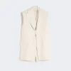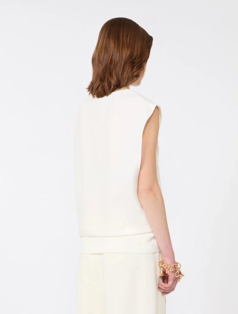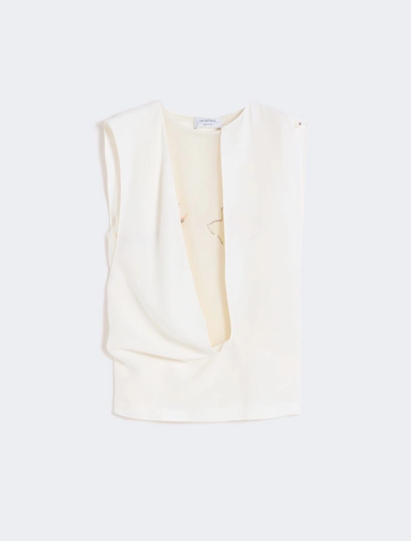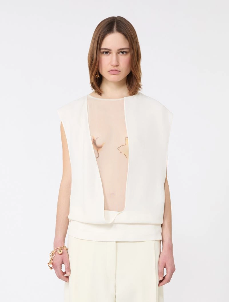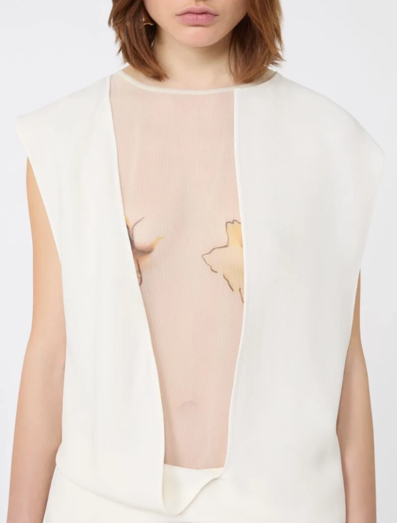 Sleeveless crop top with double-layer construction: on the outside, a viscose satin vest that drapes loosely over the front. Underneath, a semi-transparent tulle top with a floral print positioned at chest height.