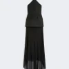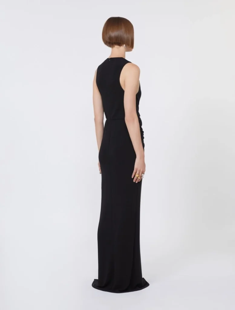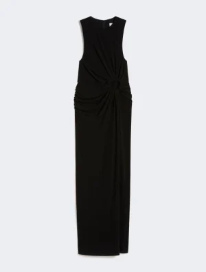 Slim-cut sleeveless round-neck dress in crepe jersey fabric. The metal ring positioned on the left-hand side creates all-over draped detail and a cut-out. Gathered motif along the right side.