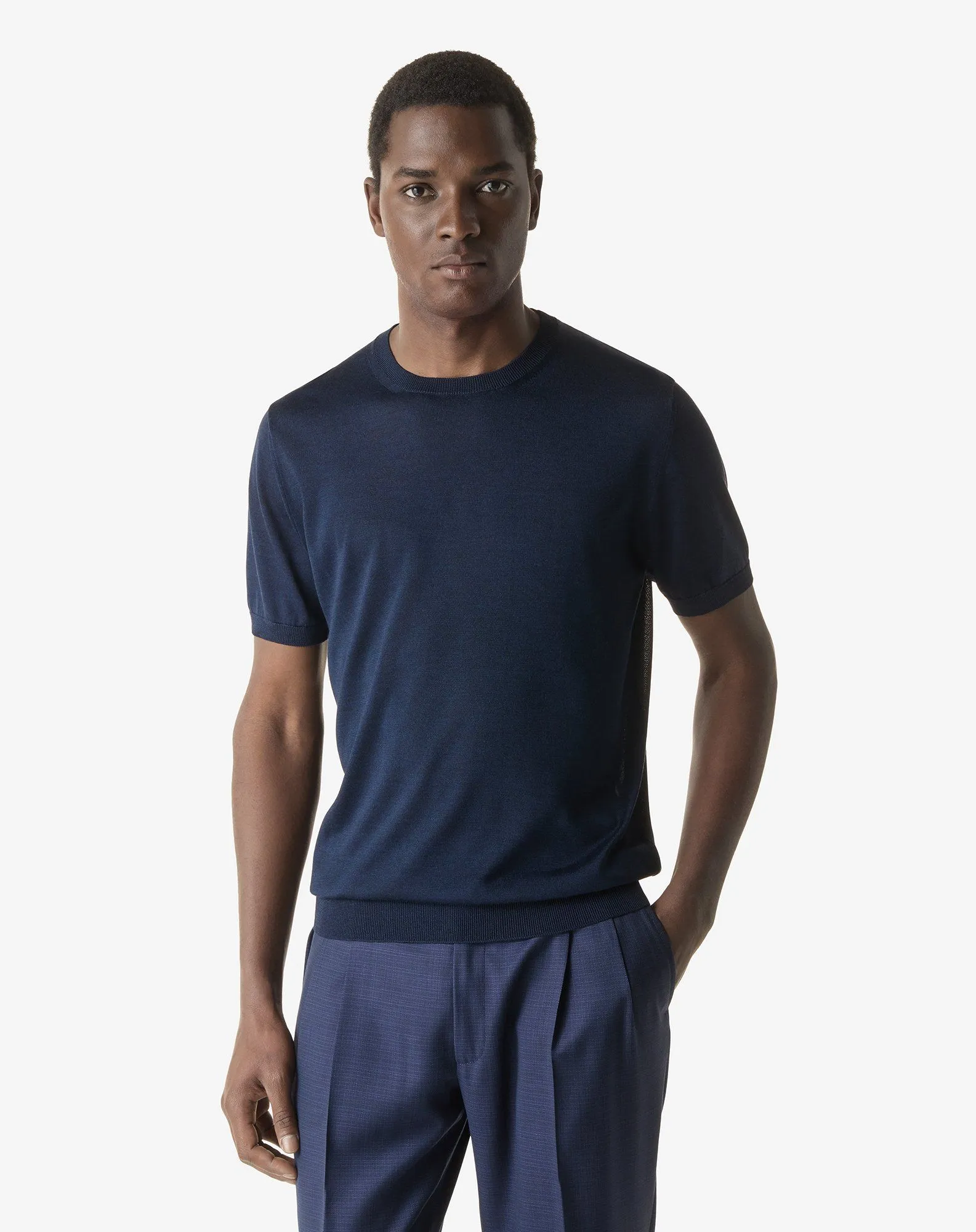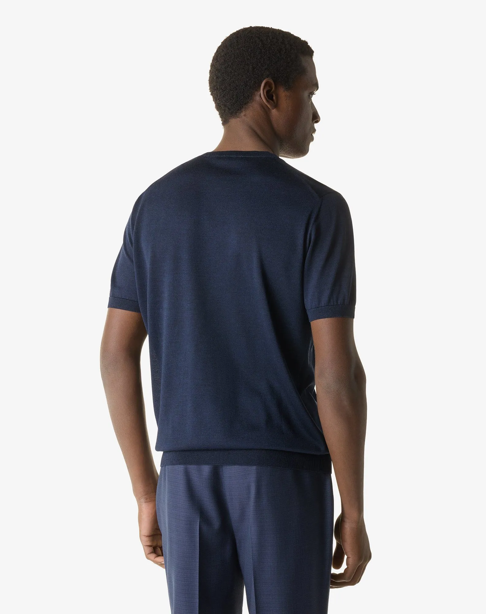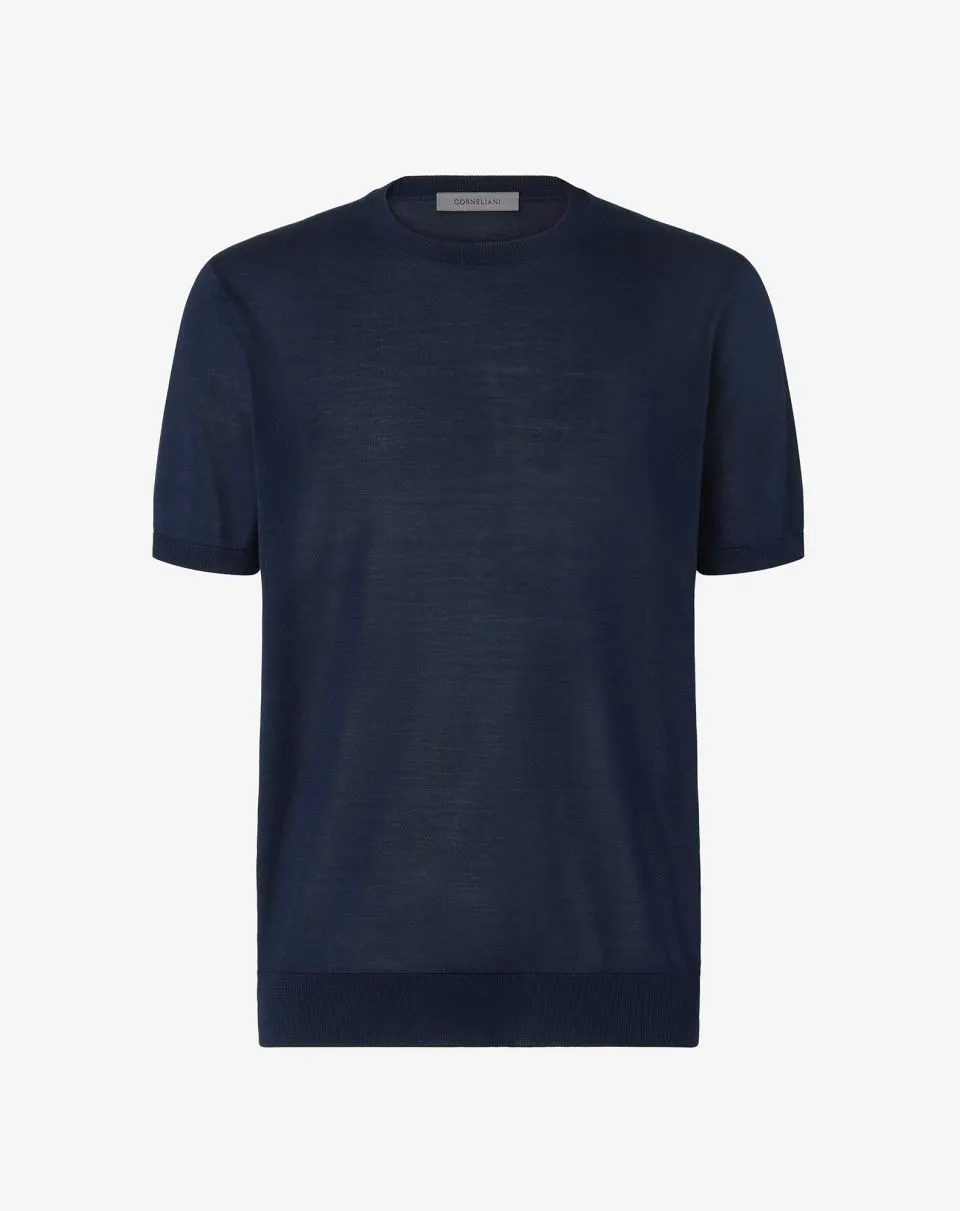 Made from fine silk, the classic short-sleeved crew neck jumper in navy blue, is an essential of the Men’s wardrobe for the Spring-Summer season. Strictly Made in Italy.