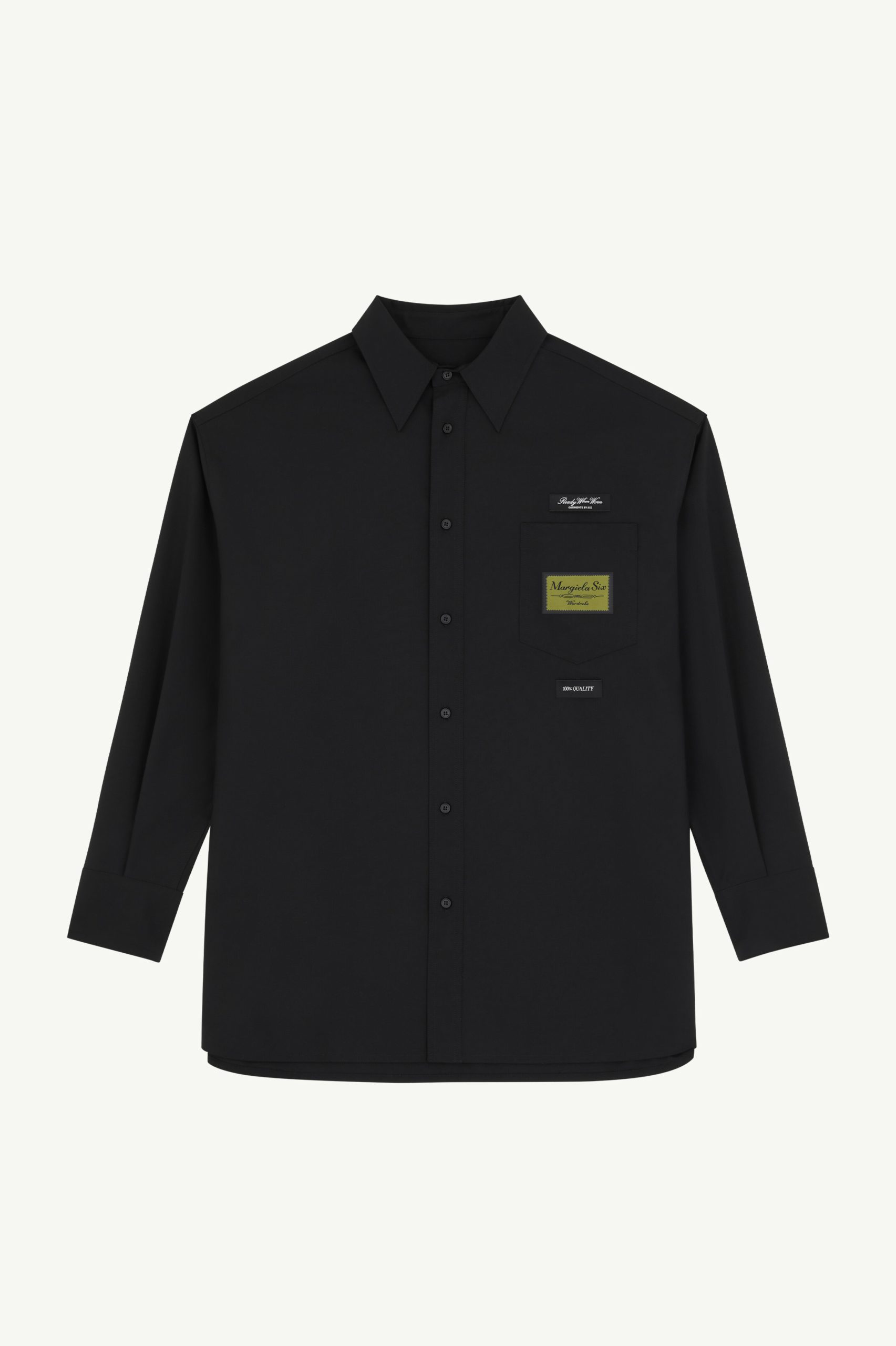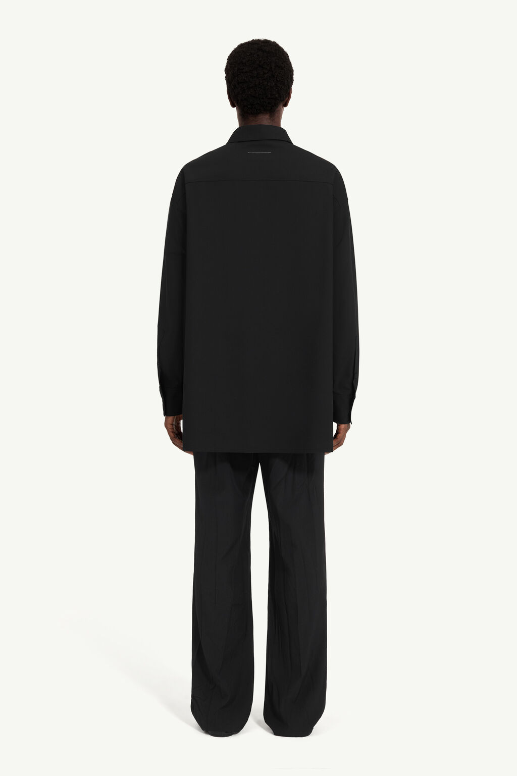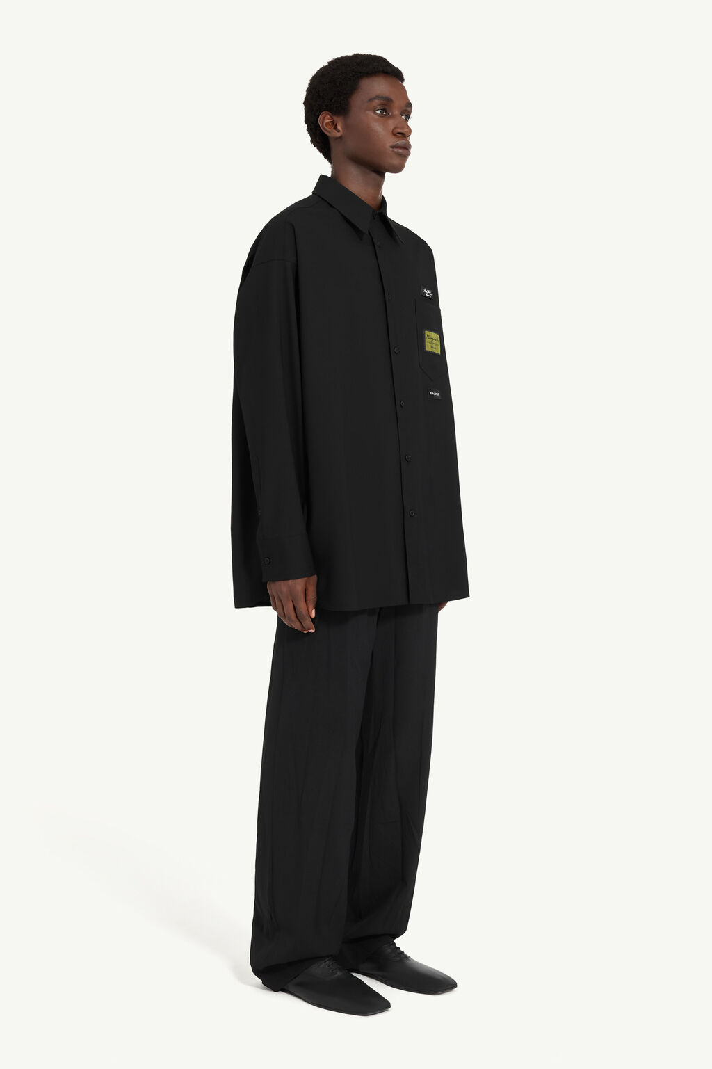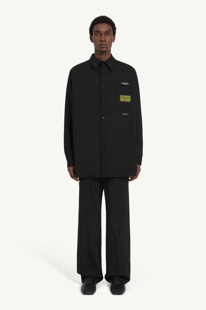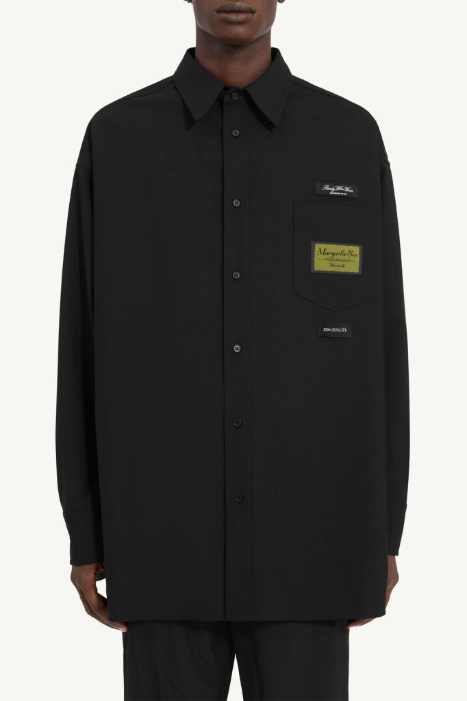 Structured in a wool blend, the shirt subverts traditional tailoring by placing internal jacquard labels at the surface. Their unexpected presence contrasts against the clean finish of the body, reworking codes of construction and presentation. The Maison’s stitch line completes the design at the back.