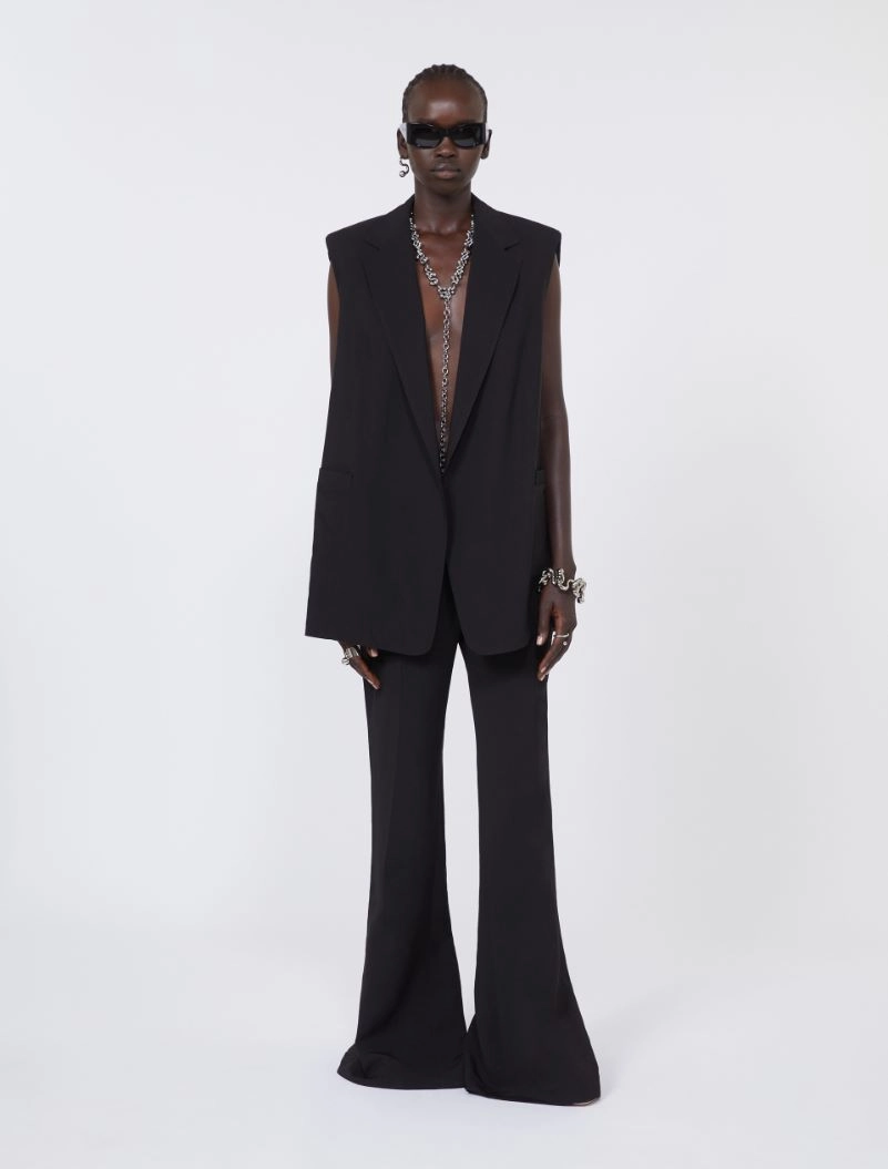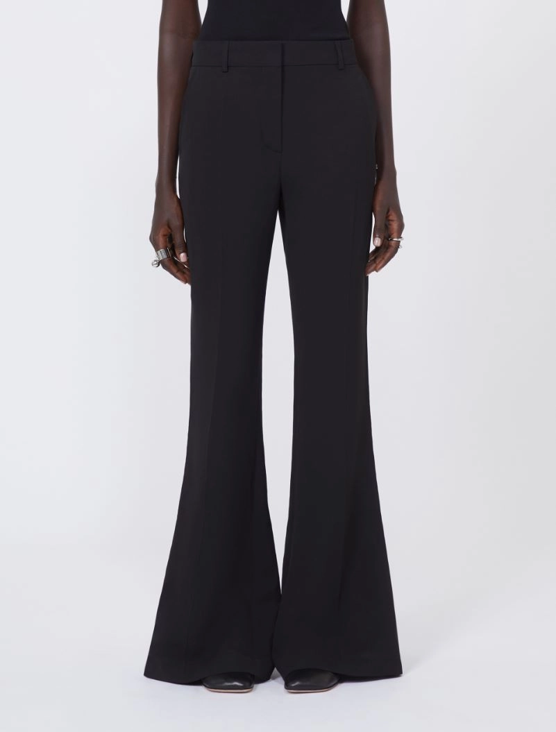Flared trousers with a slim fit and feminine cut. The construction is inspired by tailored styles, with covered lacing and trouser crease. The small overlapping rear slit further flares the leg.