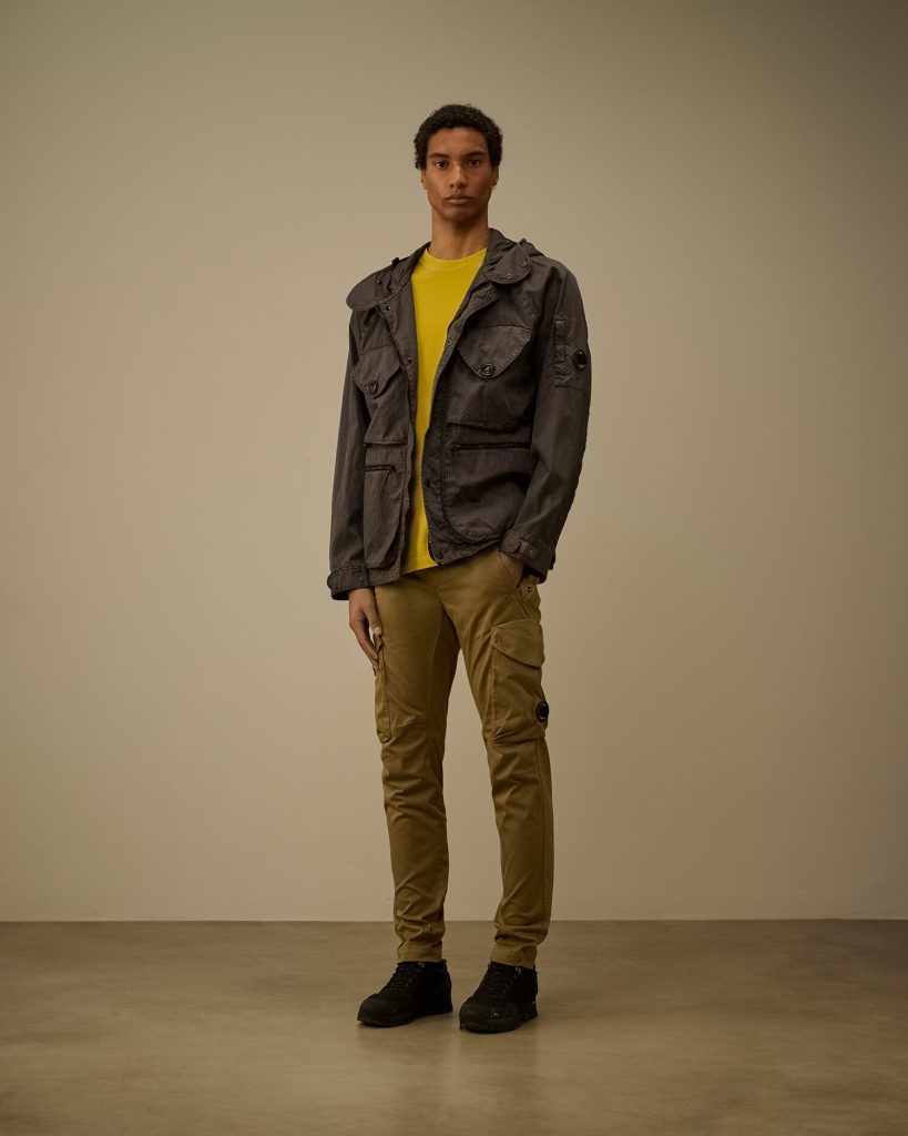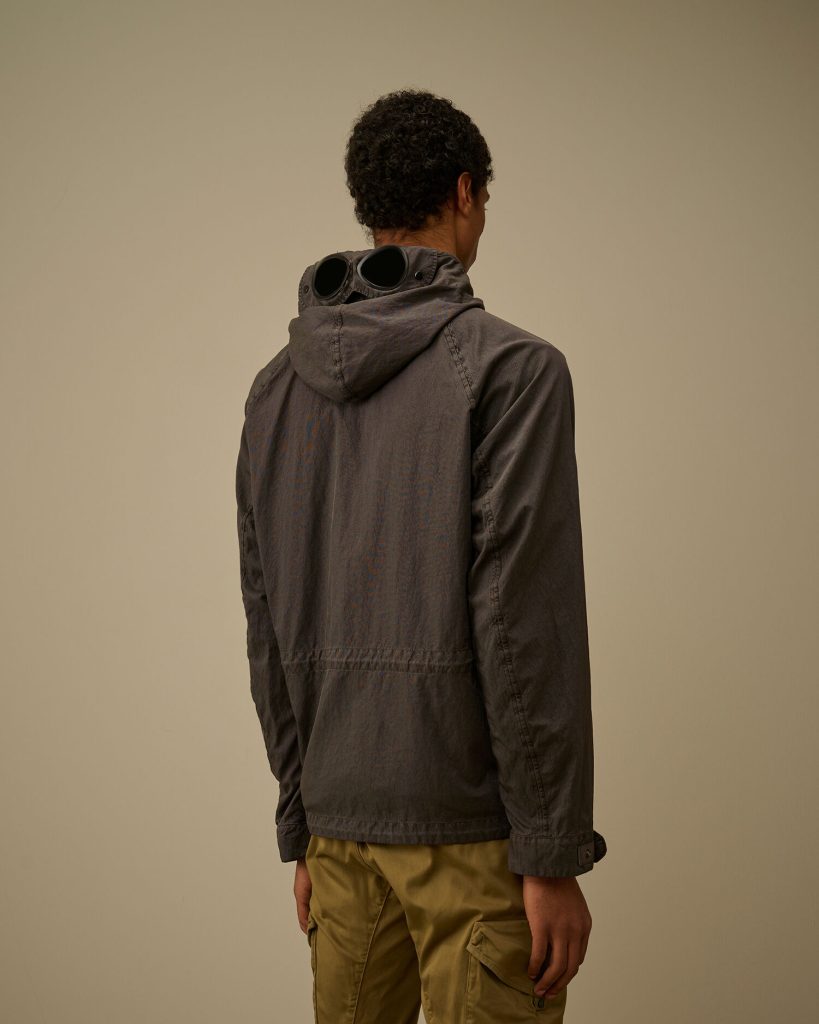 Goggle jacket crafted from Panama-R, an Oxford fabric made with recycled nylon yarns. The garment features an outer hood with a placket and snap buttons, and an inner adjustable Goggle hood in Taylon P, a heavy taslanised nylon. Equipped with a full two-way zip fastening concealed by a snap-button flap, flap chest pockets with button closure, zipped front pockets, and the iconic C.P. Company Lens on the sleeve pocket. Adjustable cuffs with snap-buttoned tabs, along with drawstrings at the waist and hem, ensure comfort and protection. Pigment dyed to give the fabric a unique, lived-in look with distinctive tonal variations. Regular fit.