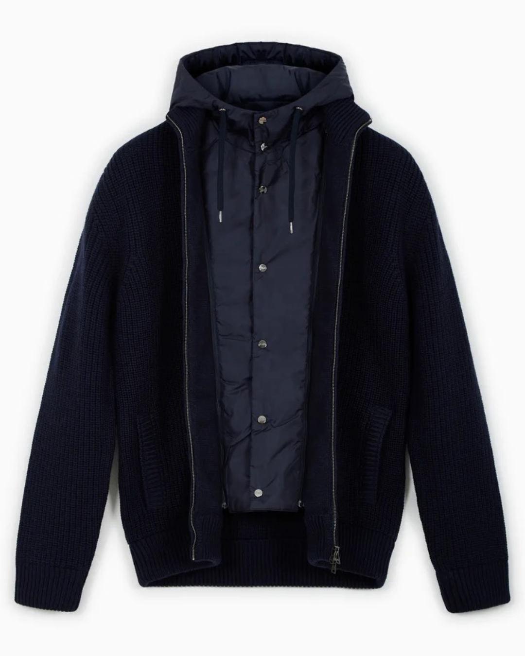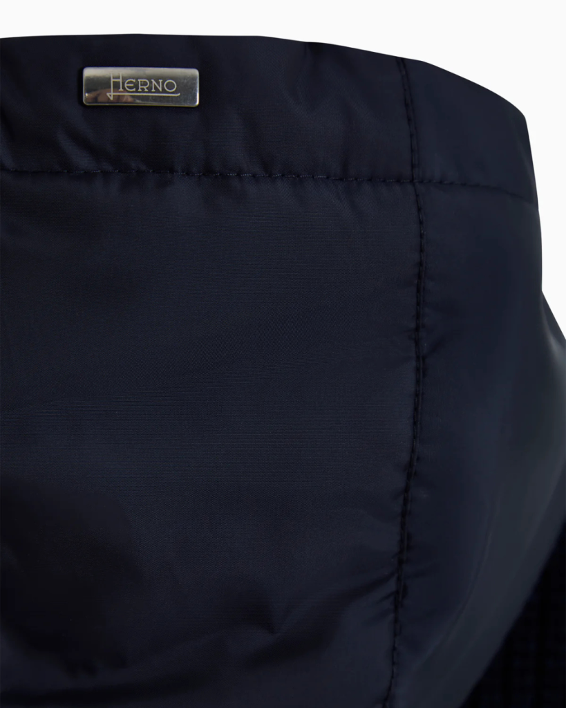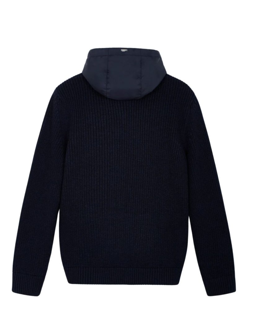 Herno ribbed wool cardigan in navy blue, with hood and nylon front panel in the same shade. Features a front zip fastening.