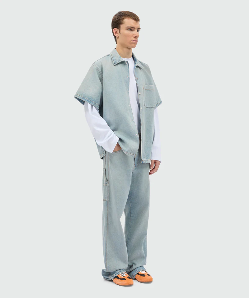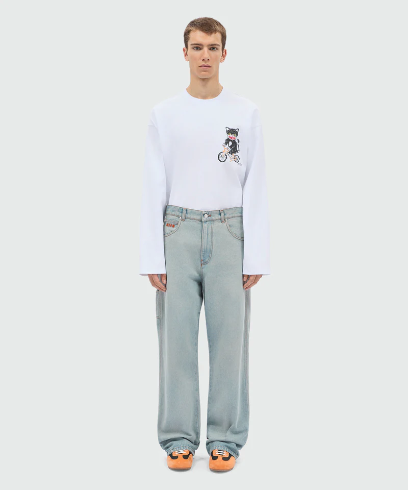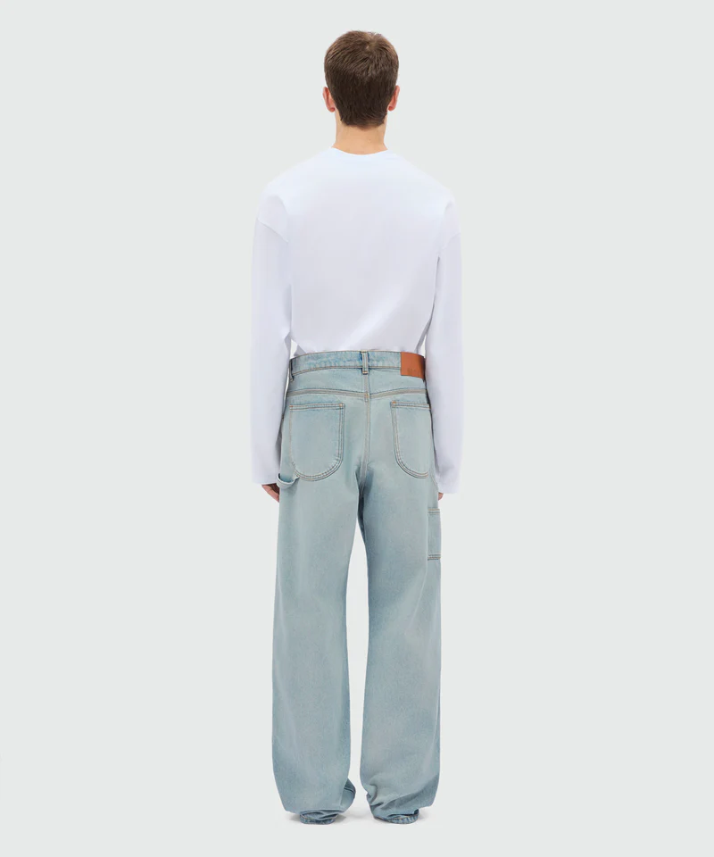 Light-wash denim trousers in a workwear-inspired five-pocket design, zip fly with metal button fastening. Front coin pocket with MSGM logo and logo patch at the back. Oversized fit.The model is wearing a size M/48.