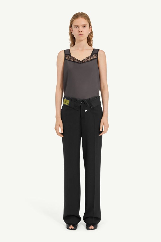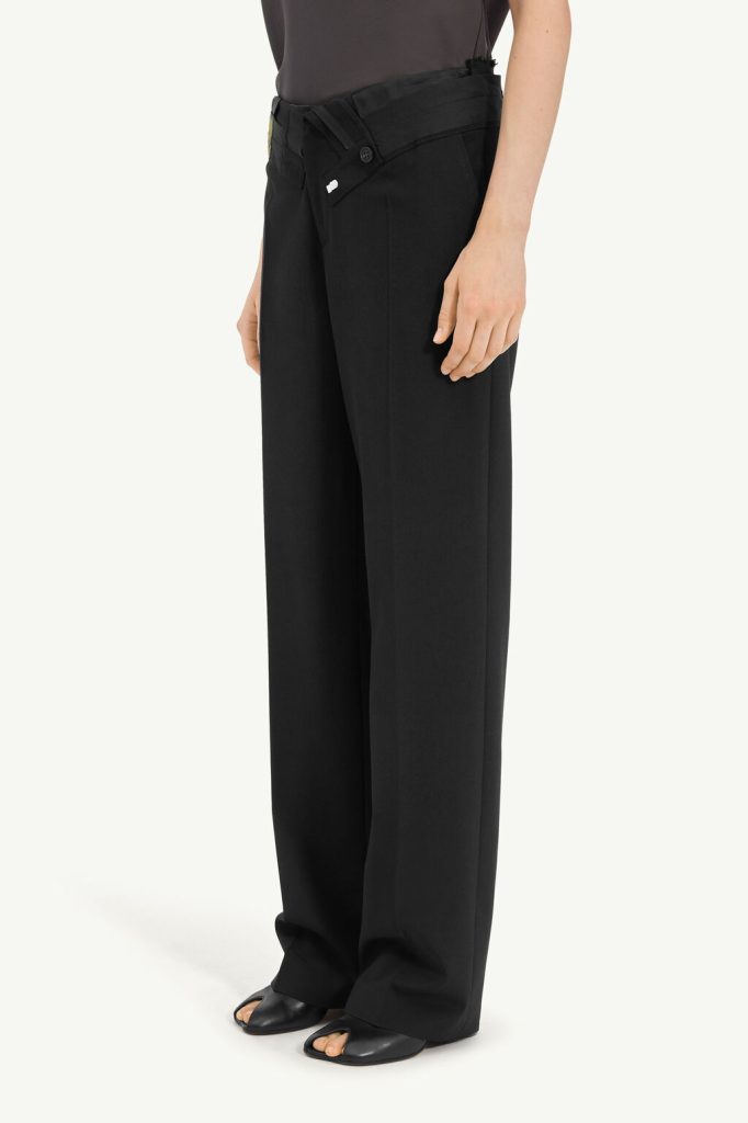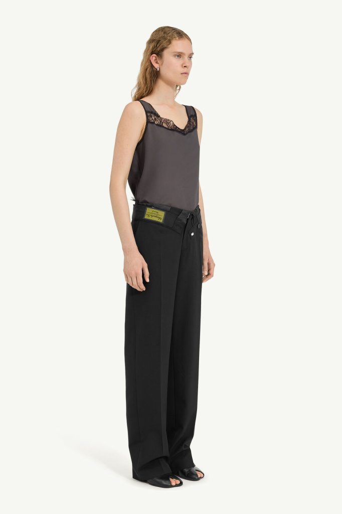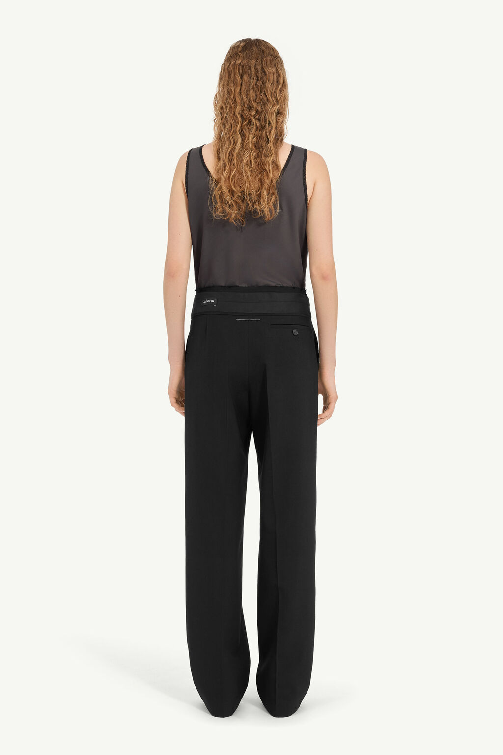 Wide-leg trousers in light wool, cut with a clean line yet reversed at the waistband to reveal raw edges, lining textures and exposed labelling. The clash of interior and exterior elements creates a subversive counterpoint to the tailored form. At the back, the MM6 white stitch line confirms its signature.