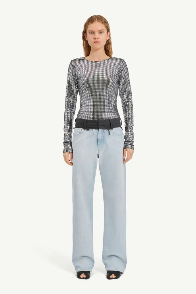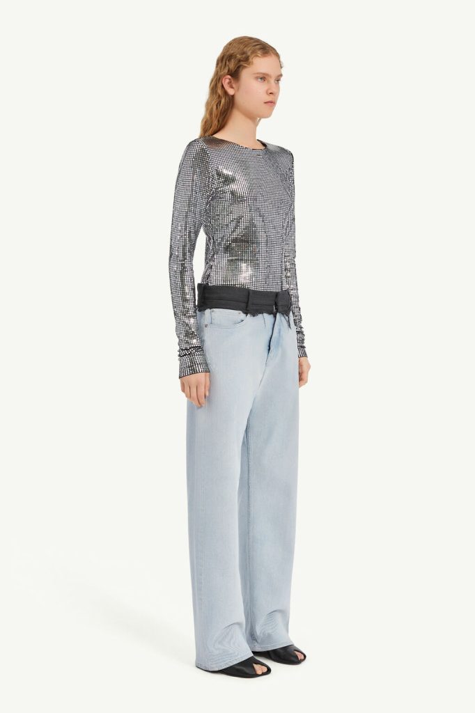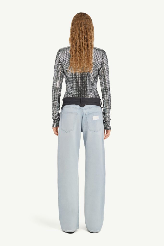 These light-wash denim trousers are redefined with a tailored wool waistband, cut raw for a deconstructed finish. The relaxed straight-leg silhouette contrasts the structured upper, subverting traditional notions of jeans. At the back, the MM6 white stitch line underscores its identity.