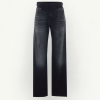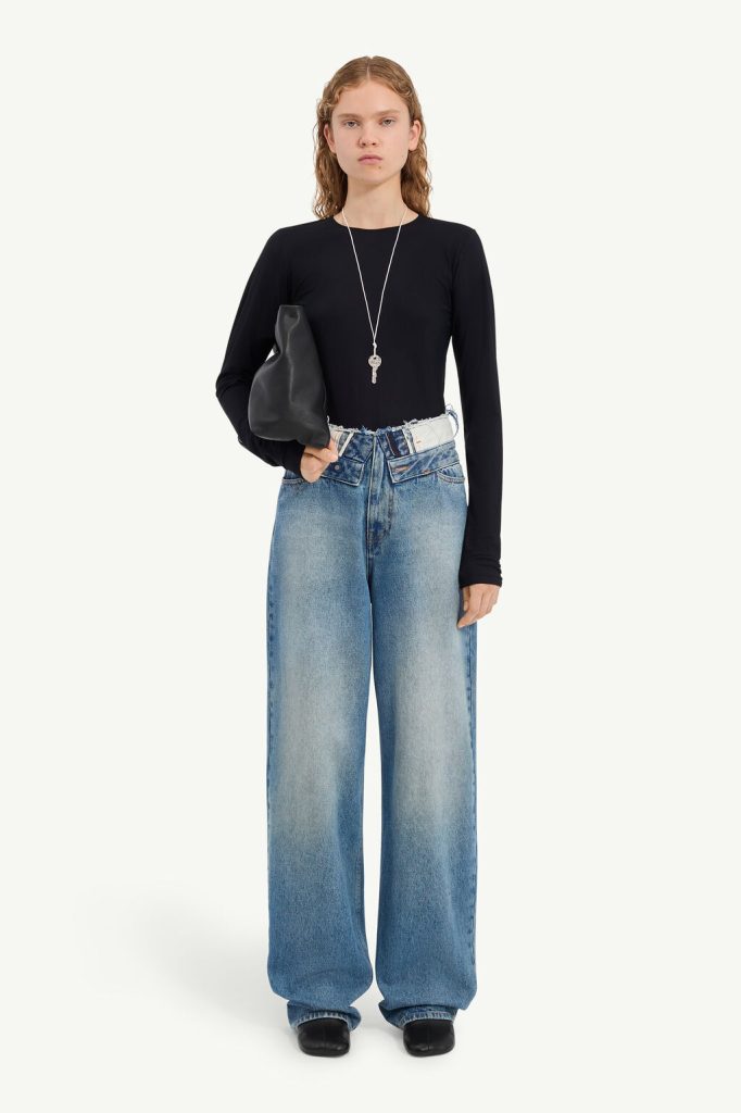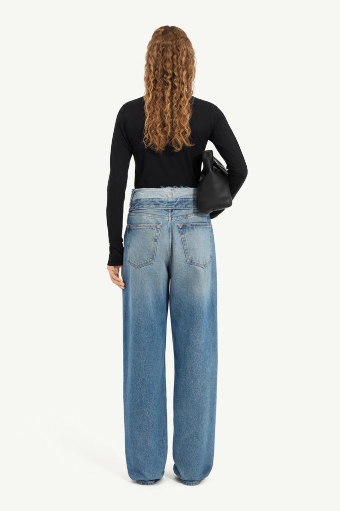 These jeans rework a straight-leg cut with a layered waistband, creating a doubled effect that reveals raw edges and inner construction. The faded wash and tobacco yarn stitching adds a lived-in character, while the unexpected tailoring detail underscores MM6’s subversive approach to denim. At the back, the white stitch line asserts its signature.