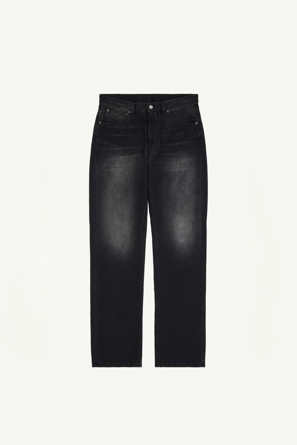 Straight-leg jeans in a washed denim, softened through fading along the thighs and knees. Classic five-pocket construction lends a familiar framework, while the Maison’s white stitch line at the back underscores its subversive spirit.