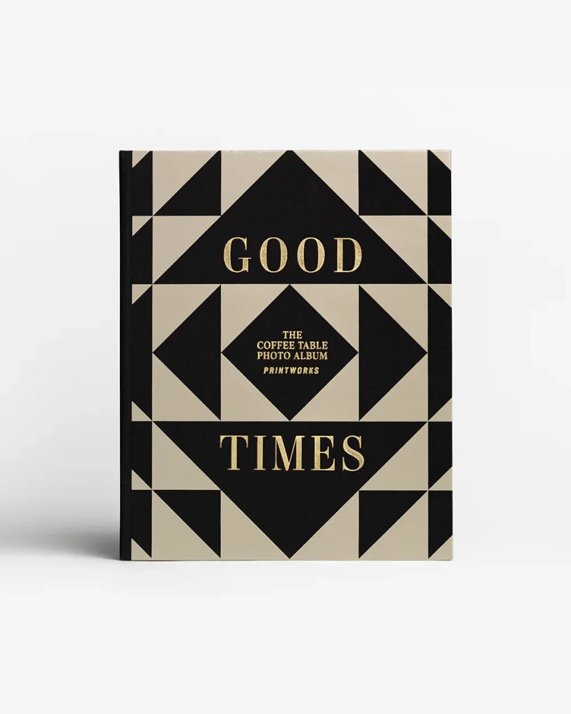 Discover our Good Times – Triangles coffee table photo album, featuring an elegant, beige and black cloth cover with gold foiled text.