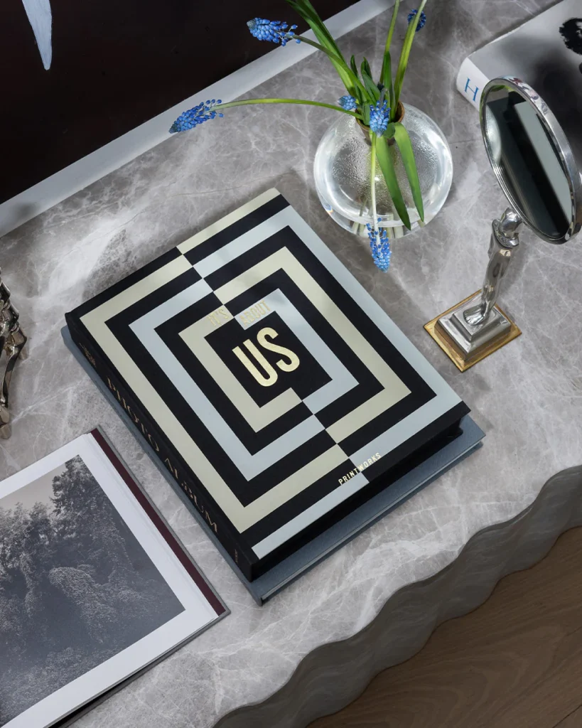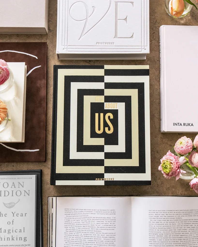 Discover our It’s About Us coffee table photo album, featuring an elegant, multicolor cloth cover in black, gold, and white with gold foiled text.