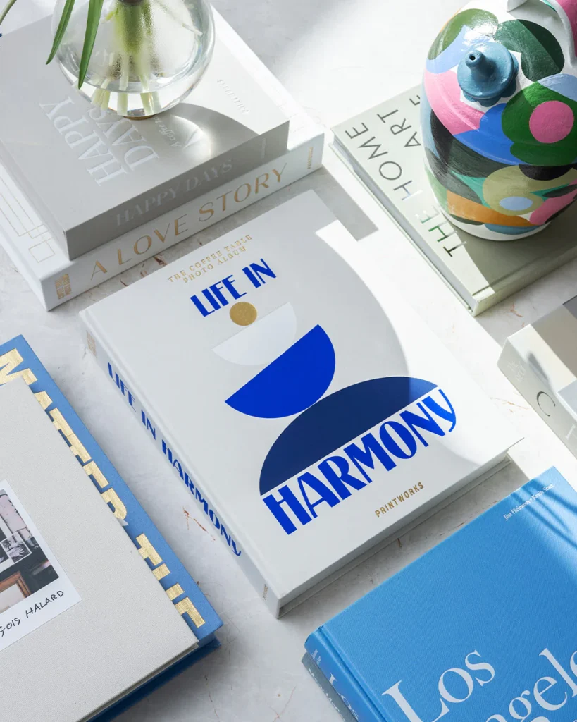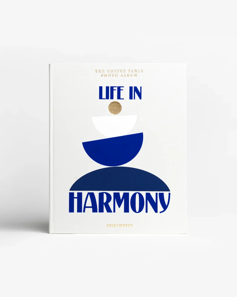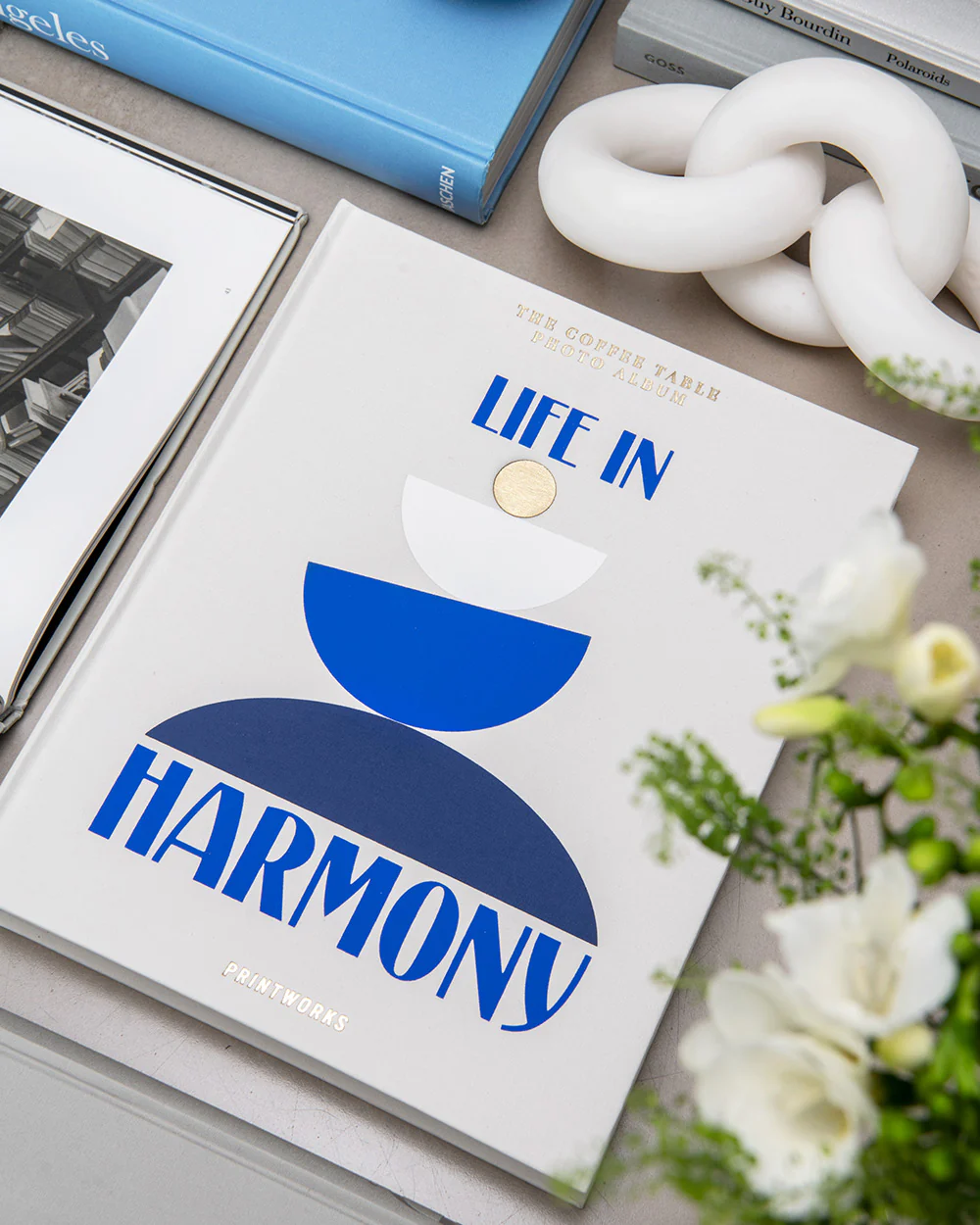 Discover our Life in Harmony coffee table photo album, featuring an elegant white cloth cover with blue text.