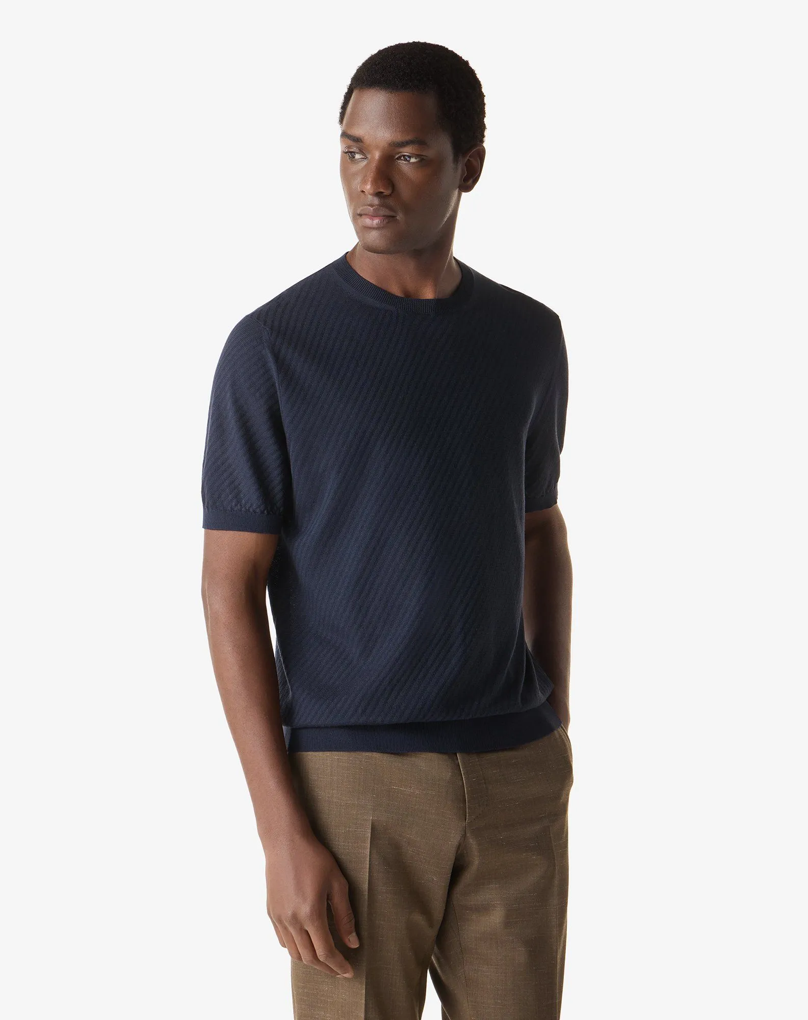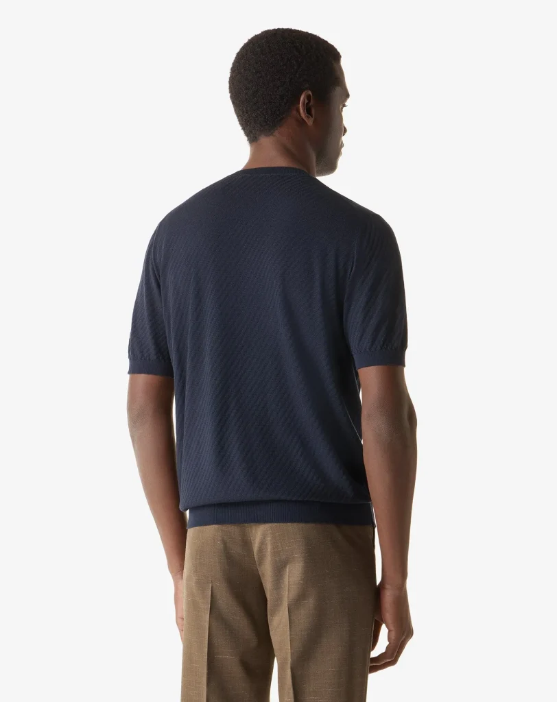 This navy blue full zip sweatshirt interprets leisure time with minimalist aesthetic applied to the finest fabric: ice cotton and silk, for a light and pleasant feel. The exclusive diagonal work adds depth to the garment without making it technical or complex. Made in Italy, it is ideal as an everyday layer for your days in the city and travel.