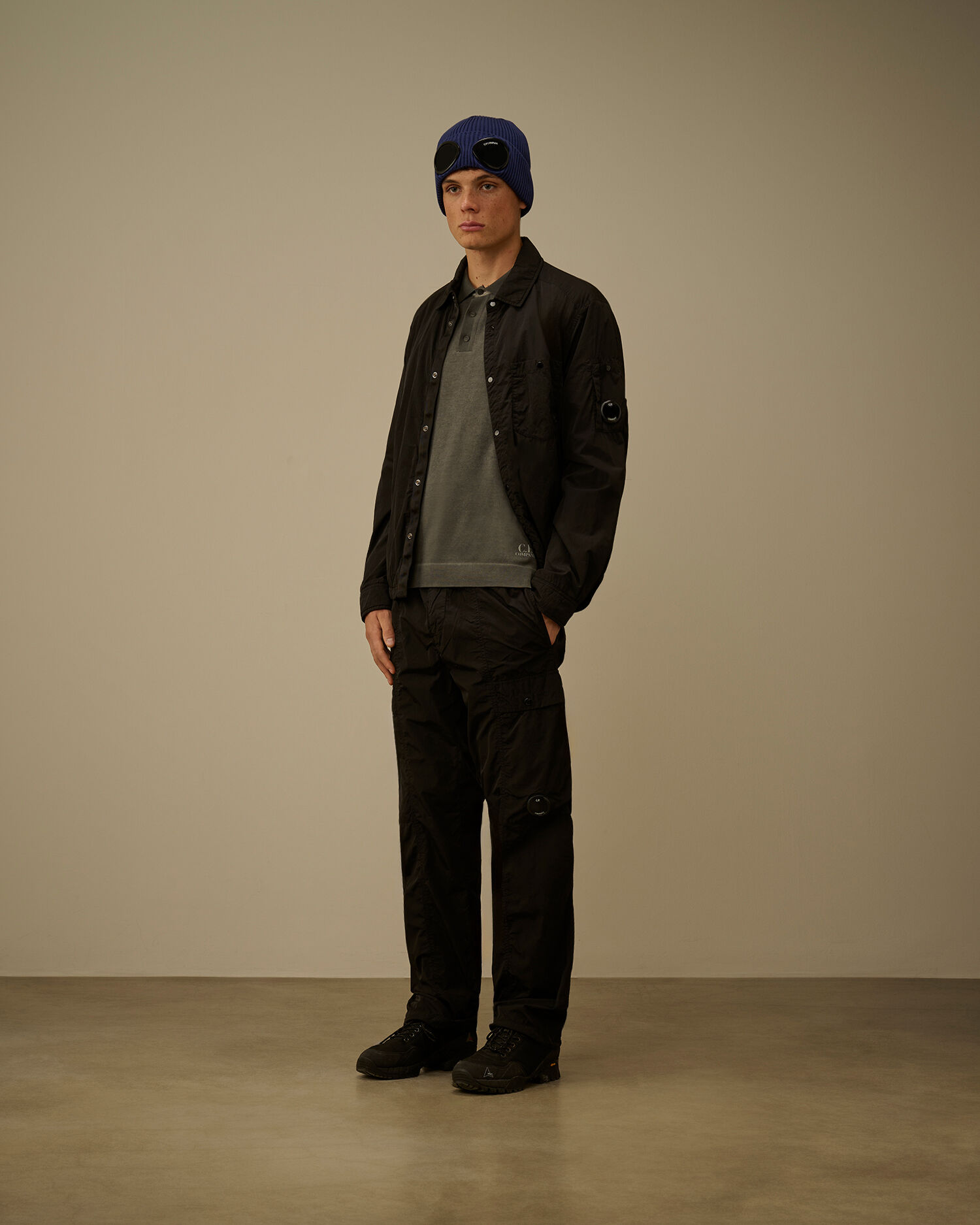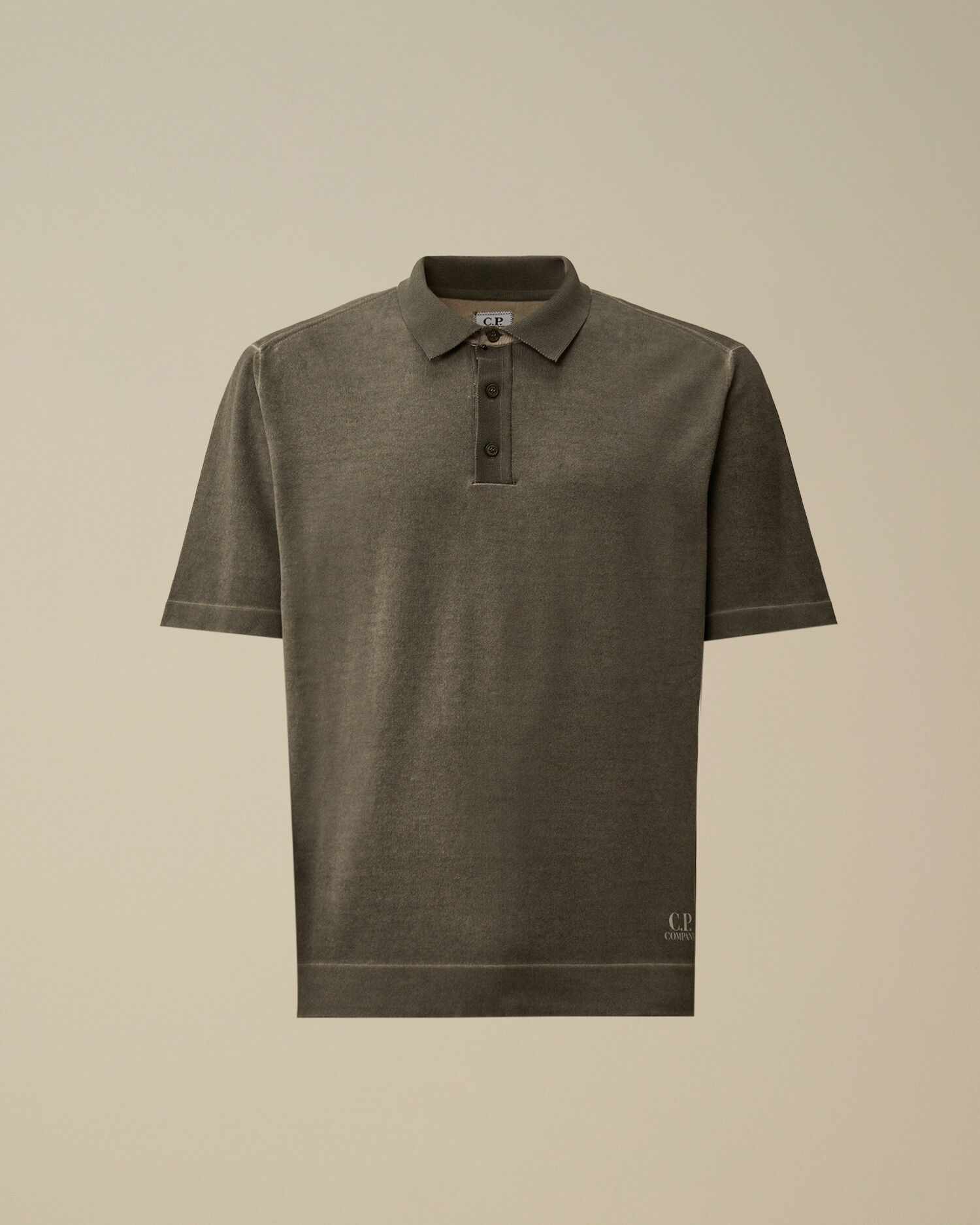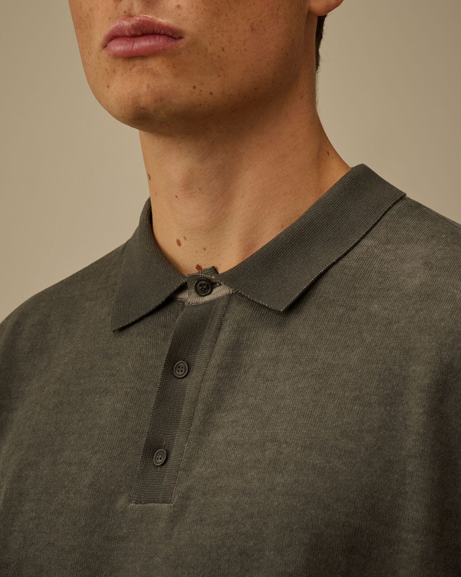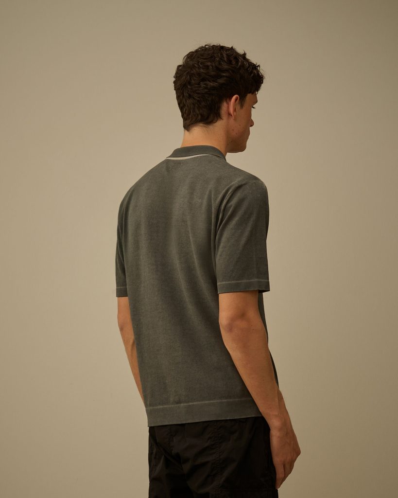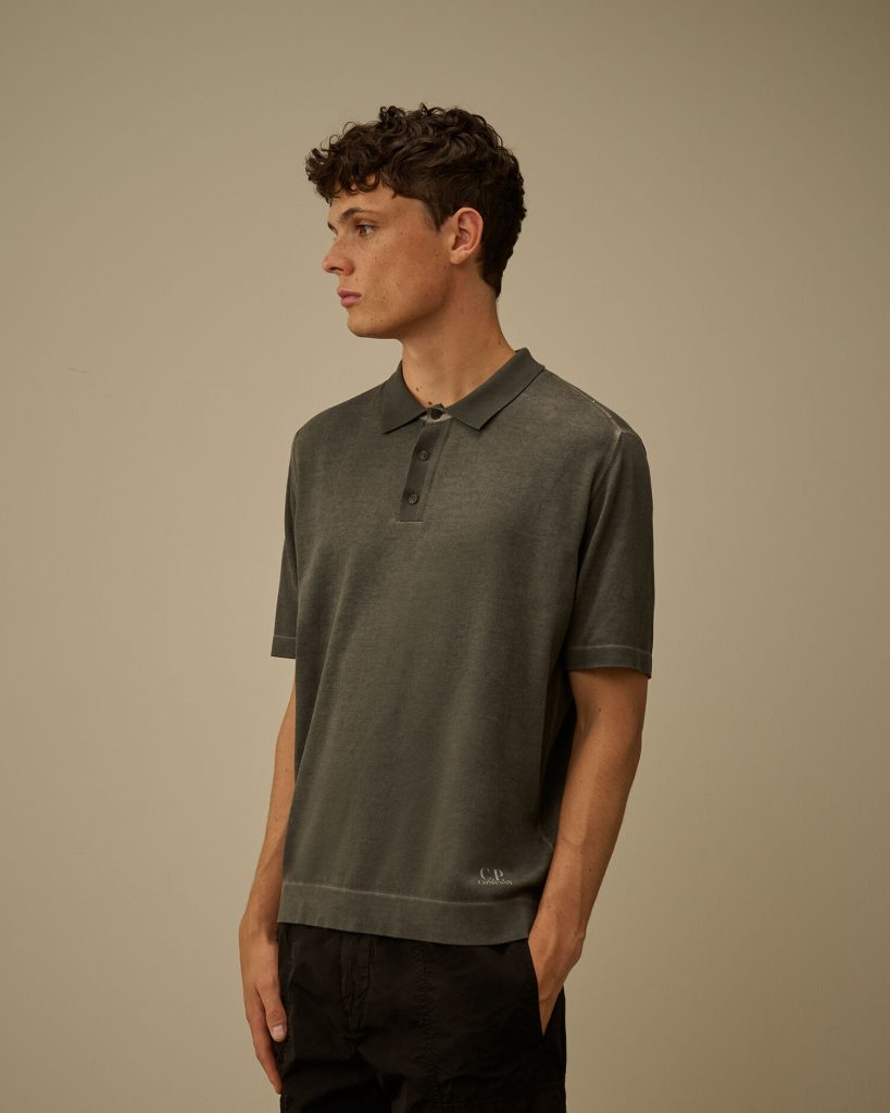Polo sweater crafted from cotton crepe, a lightweight and breathable fabric with a naturally irregular texture. The model features a ribbed collar with a three-button fastening and a printed logo on the hem. The garment undergoes a double cold-dyeing process: first, it is fully dyed, then the outer side is treated with a pigment spray colour, creating a subtle two-tone effect between the exterior and interior. Gauge 14. Made in Italy. Regular fit.