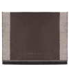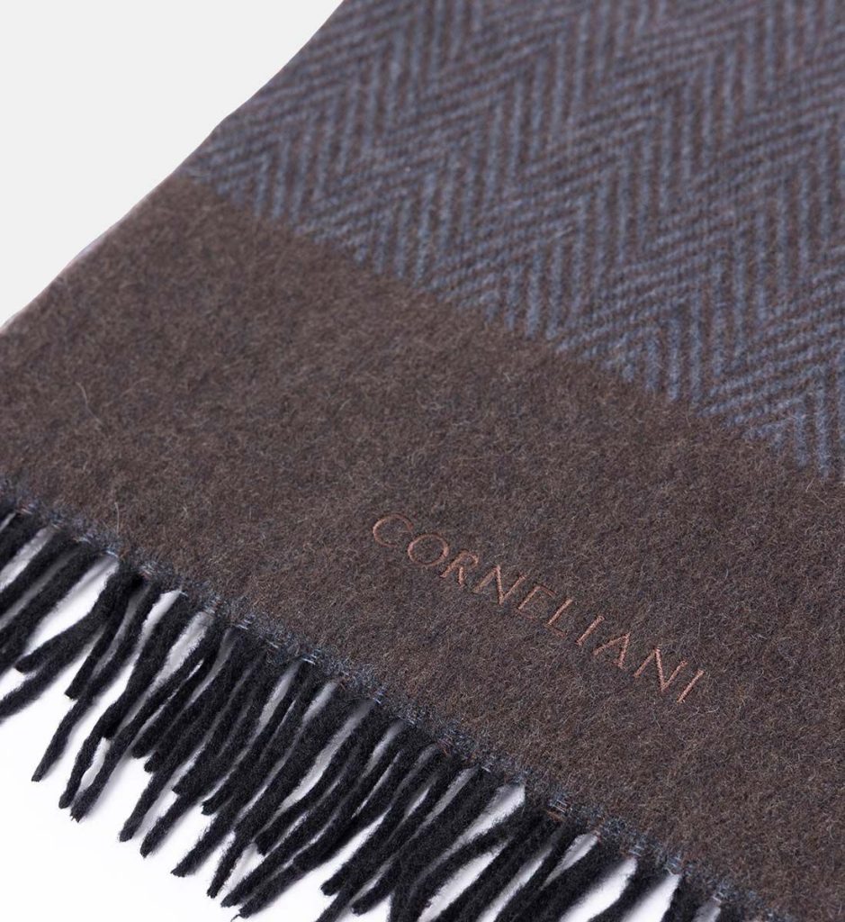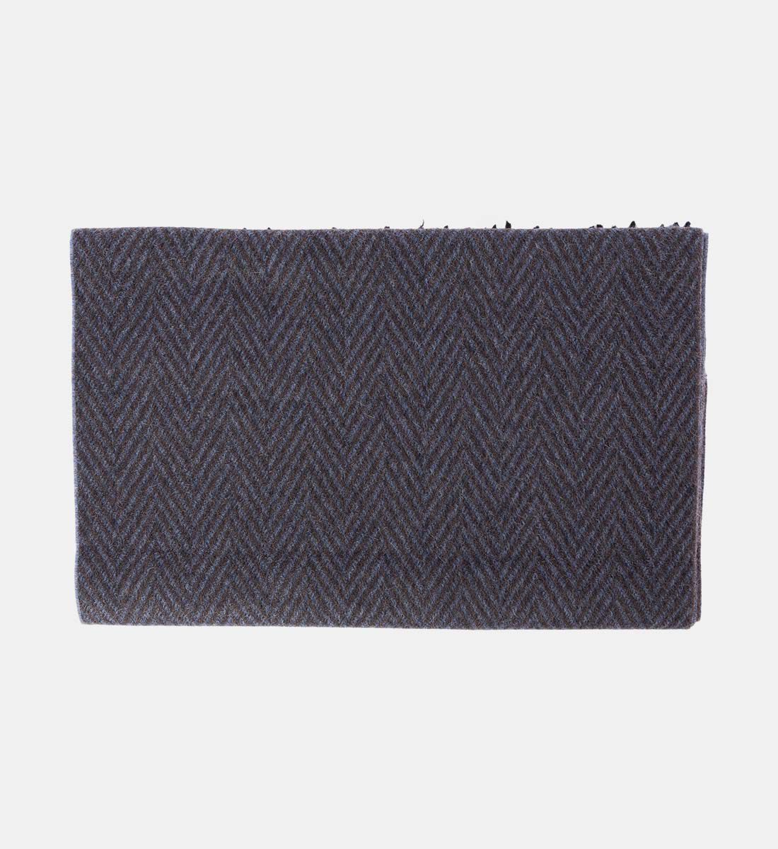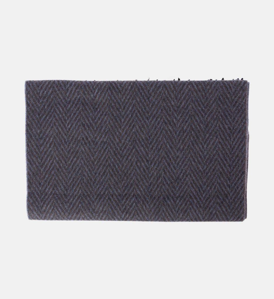 Classic and refined, this herringbone scarf blends grey and soft blue tones, transitioning into a warm brown band with subtle detailing. Finished with dark fringe, it offers timeless texture and understated depth for cool-weather looks.