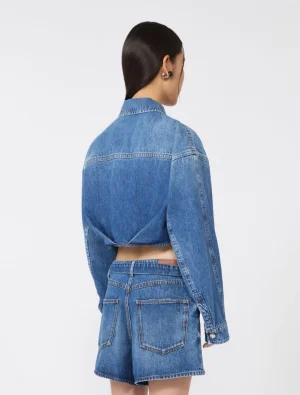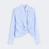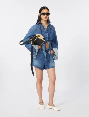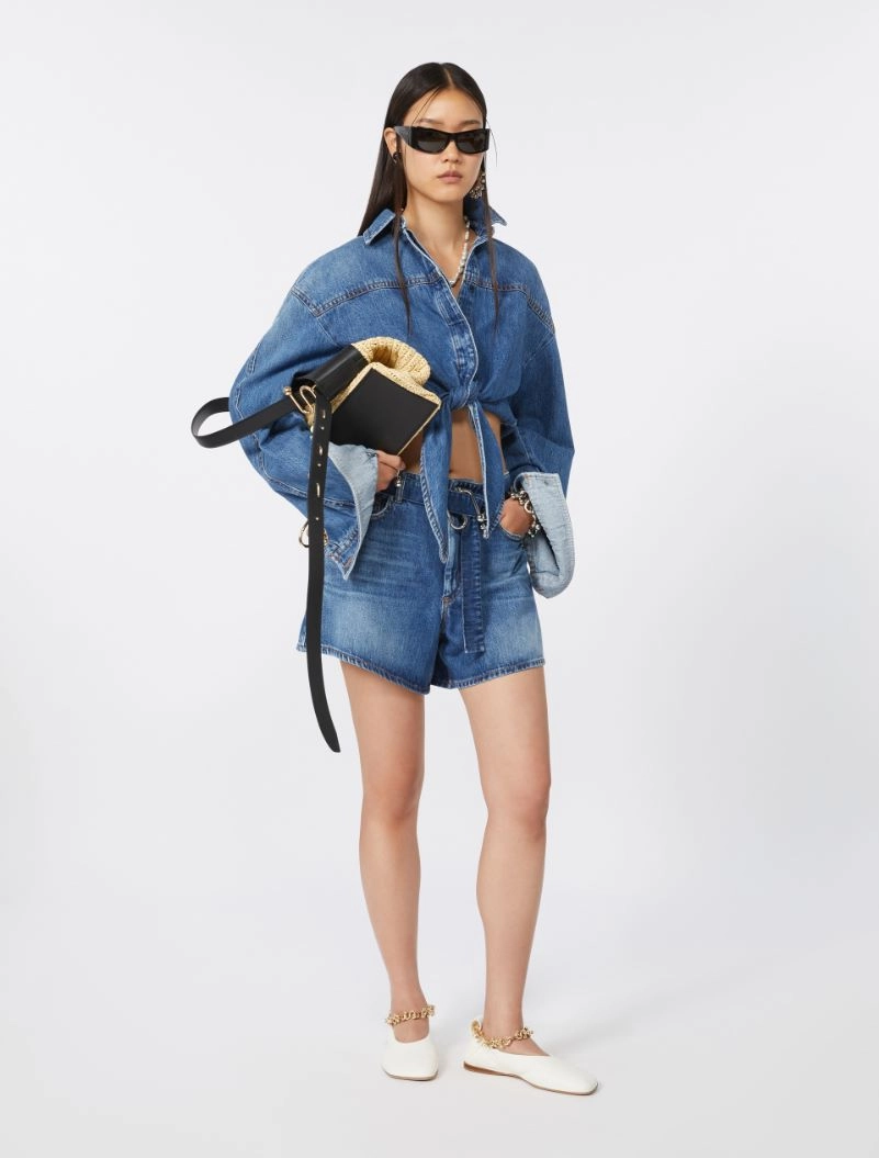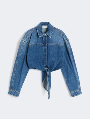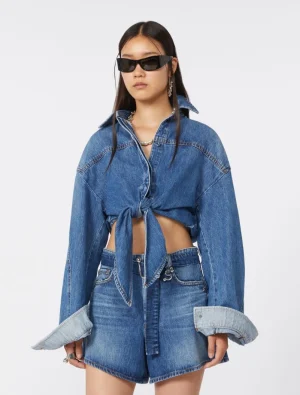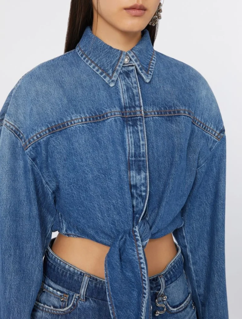 Mannish-style denim shirt featuring a waist-length cut and knot detail on the front. The contrasting topstitching highlights the structural darts on the yoke, shoulders and sleeves. – Authentic non-stretch indigo denim shirt with medium vintage treatment – Shirt collar with a placket-covered button fastening – Contrasting tobacco-coloured topstitching – Knot detail at the hem – Regular fit