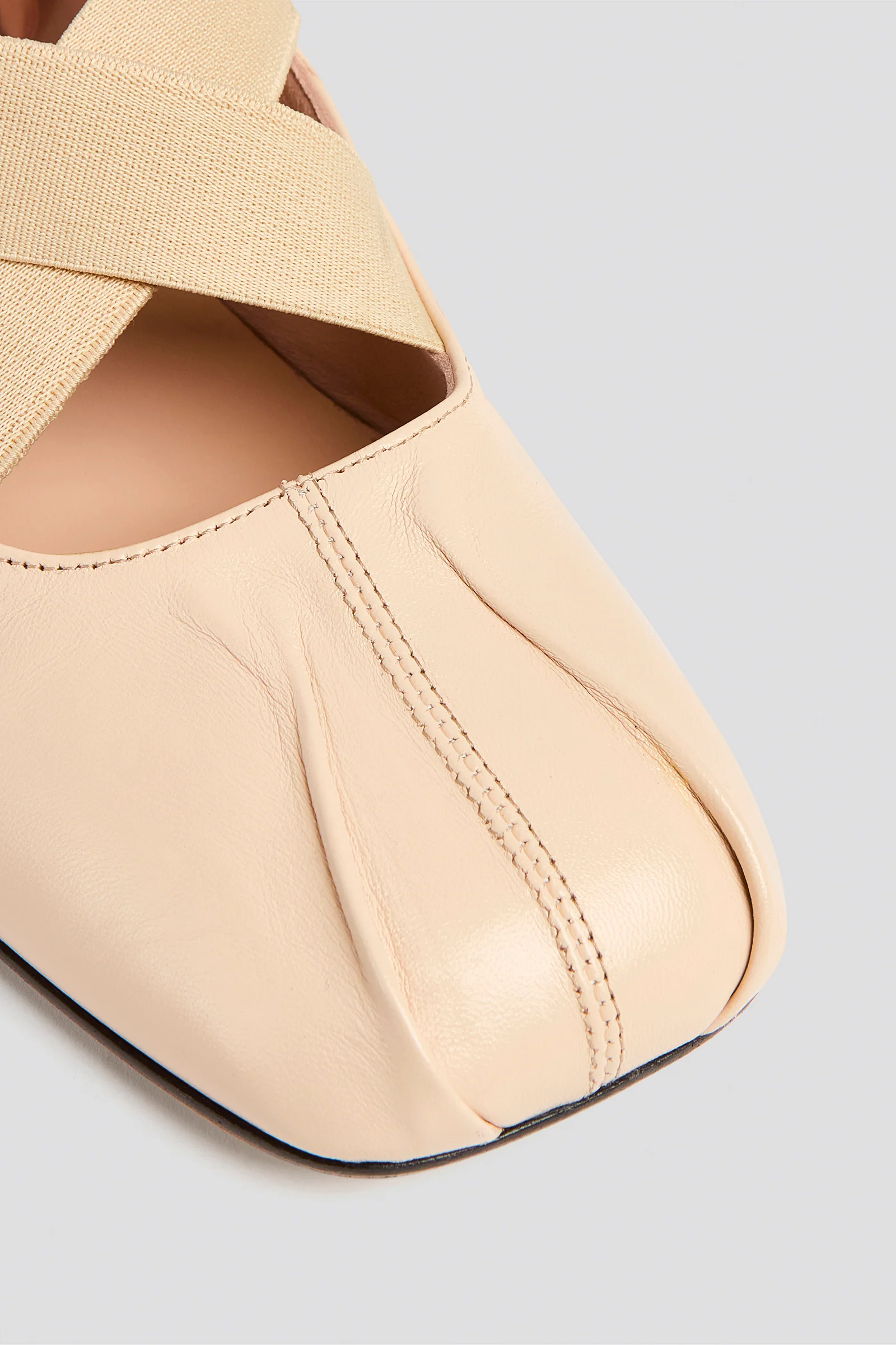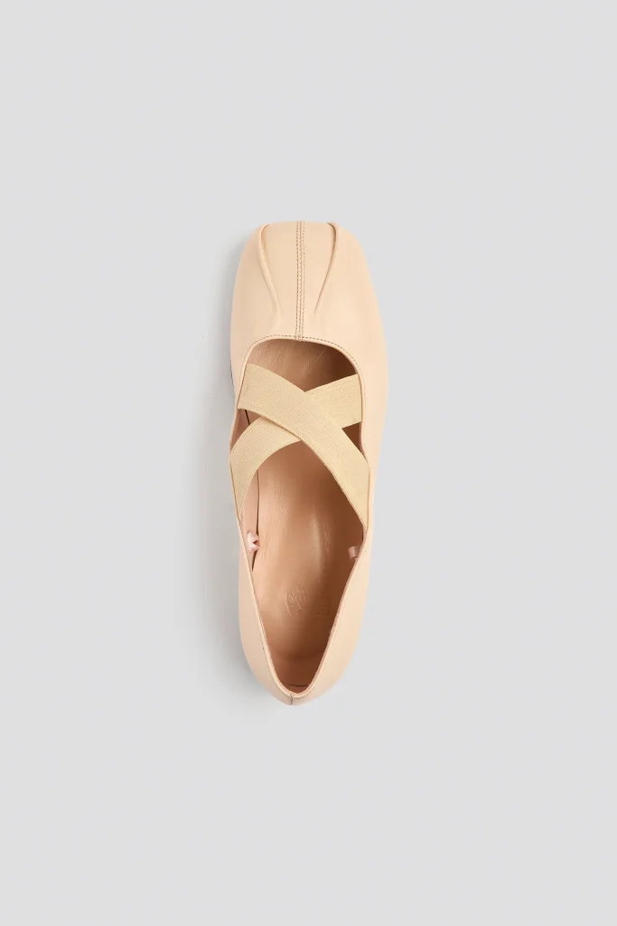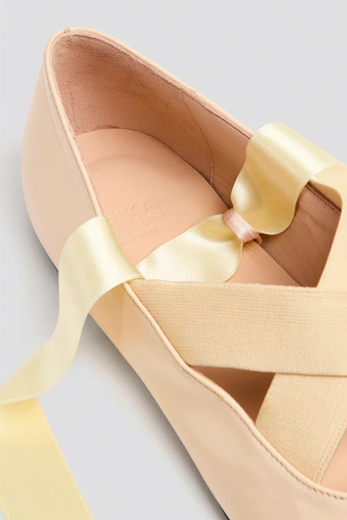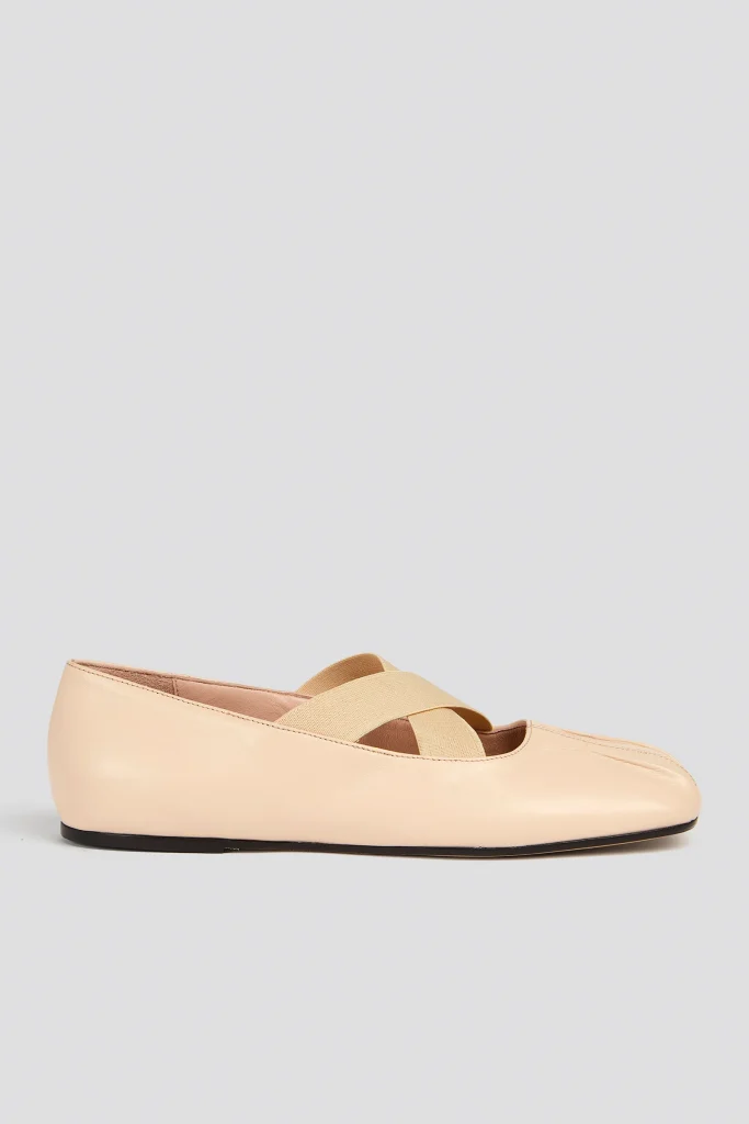 BALLERINA FLATS IN GENUINE LEATHER, ROUNDED SQUARE TOE, CROSSED ELASTIC STRAPS AT THE BALL OF THE FOOT AND SATIN LACES THAT TIE AT THE ANKLE, THIN SOLE.