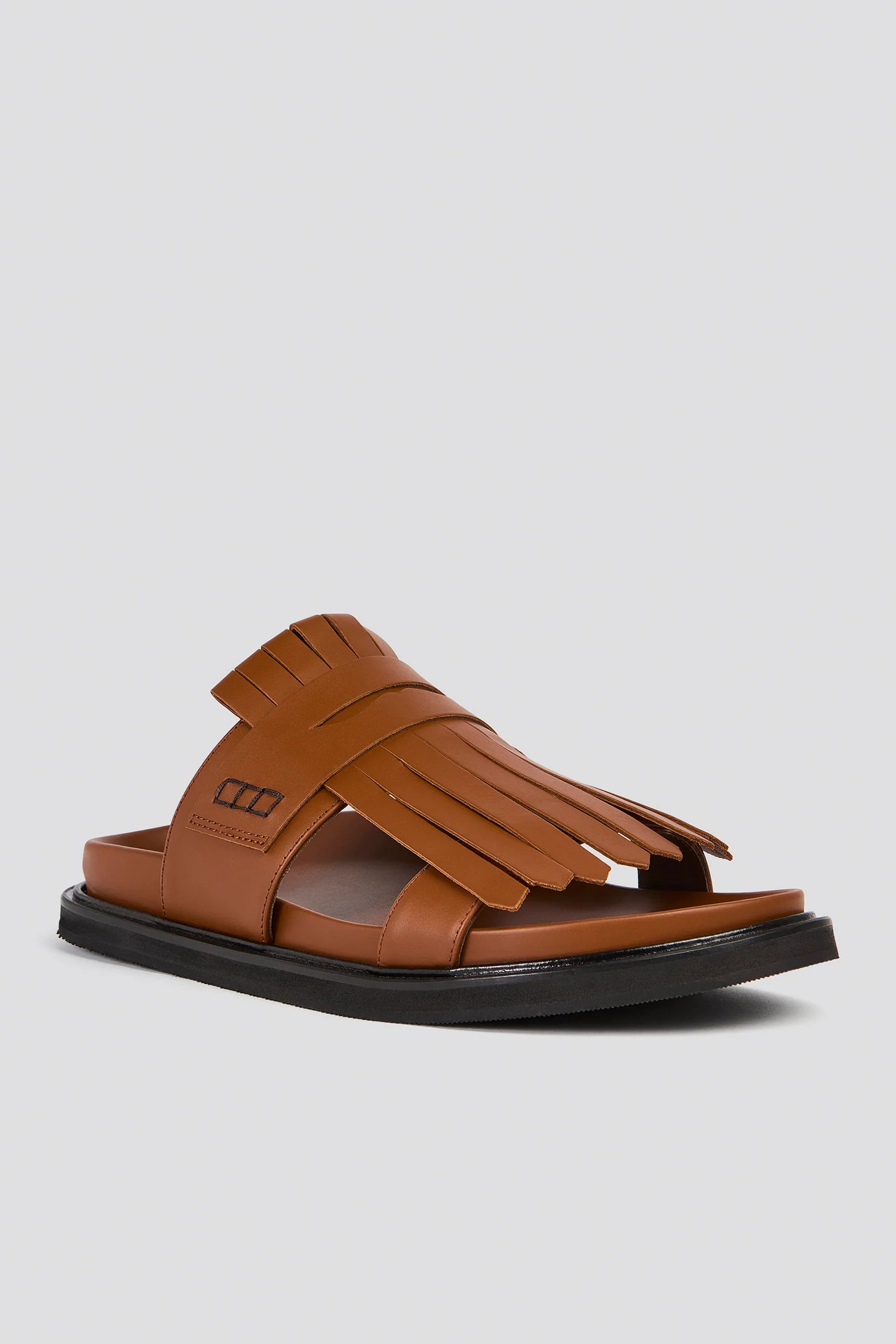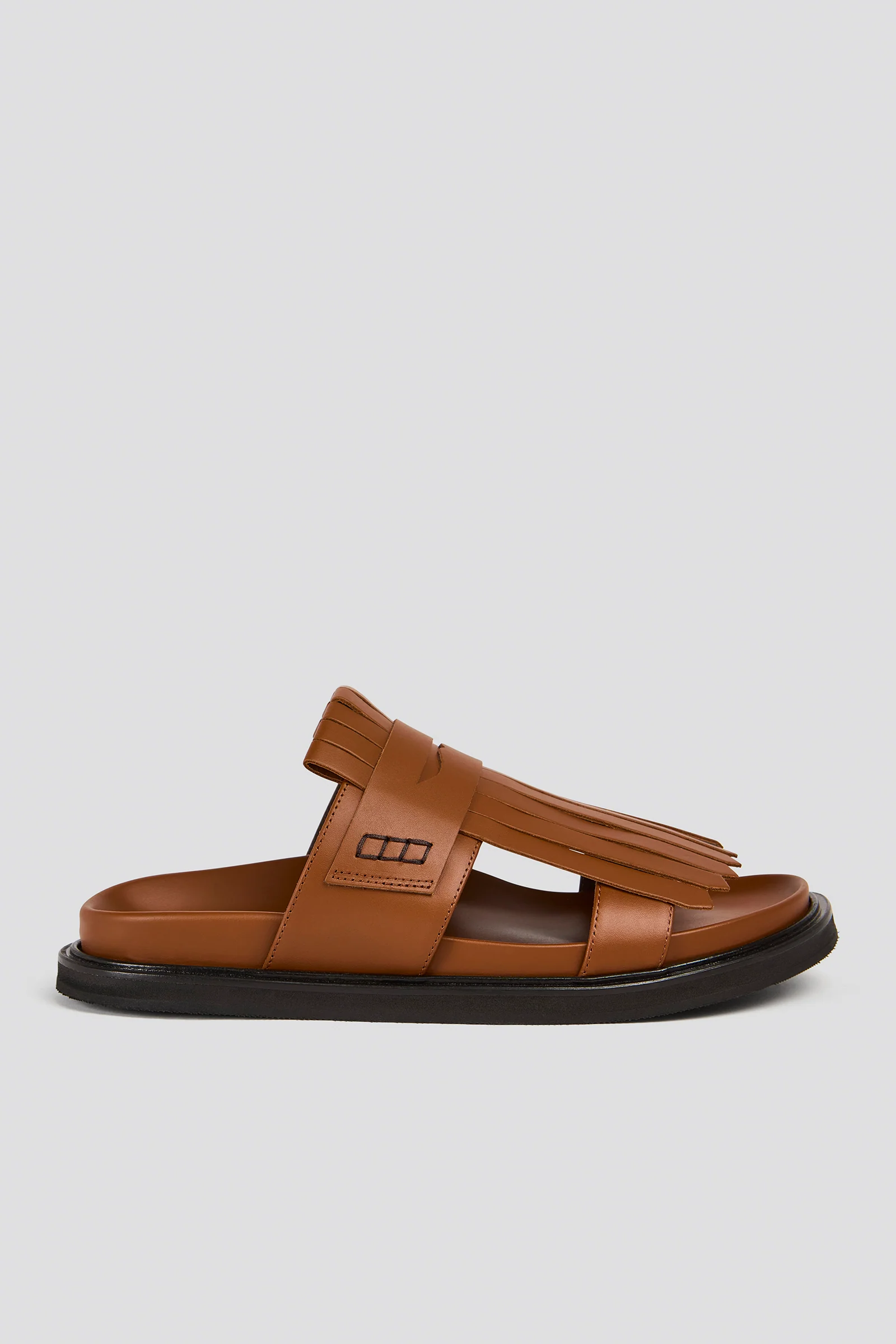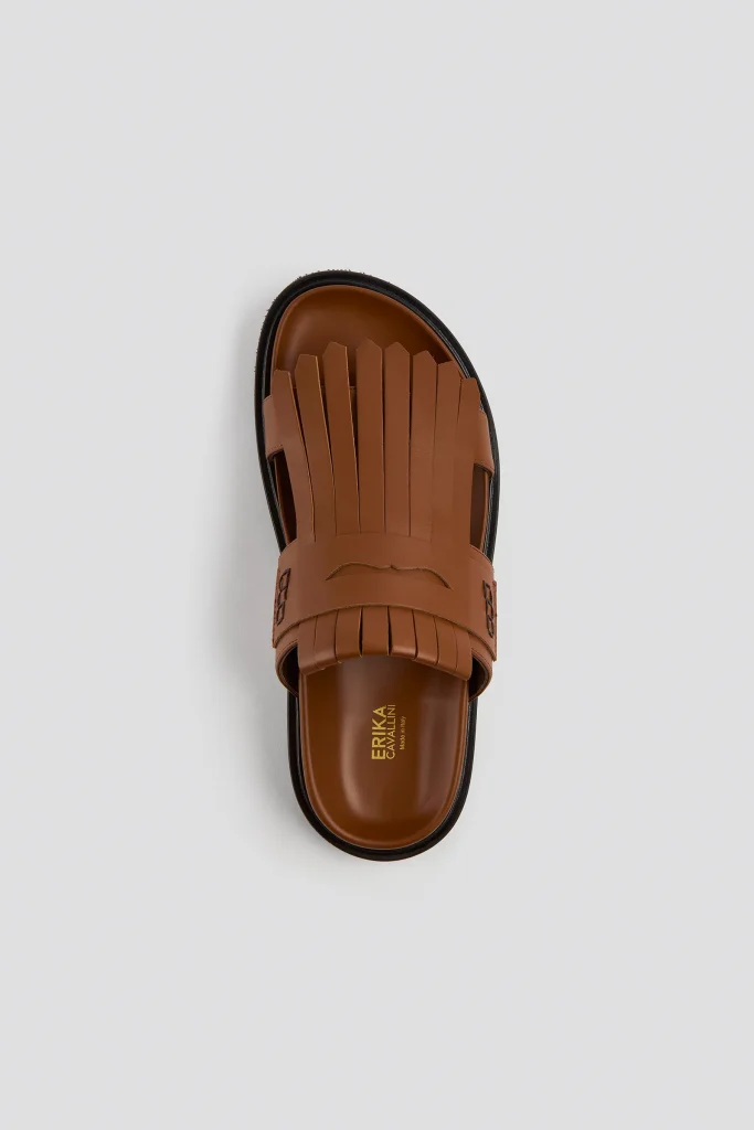 FUSBET IN GENUINE LEATHER, UPPER WITH WIDE STRIP AND MOCASIN-STYLE FRINGE DETAIL ON THE BACK, SHAPED INSOLE, THICK BLACK SOLE, COMFORTABLE AND STURDY STYLE.
