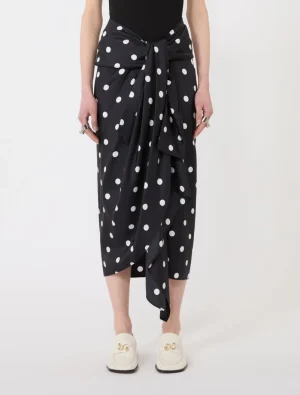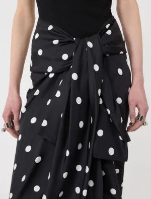 A fresh polka dot pattern on silk twill instantly renders this pencil skirt original, with a large front knot that creates draping and natural pleats at the hip. Back hook and zip fastening. Asymmetrical hem.