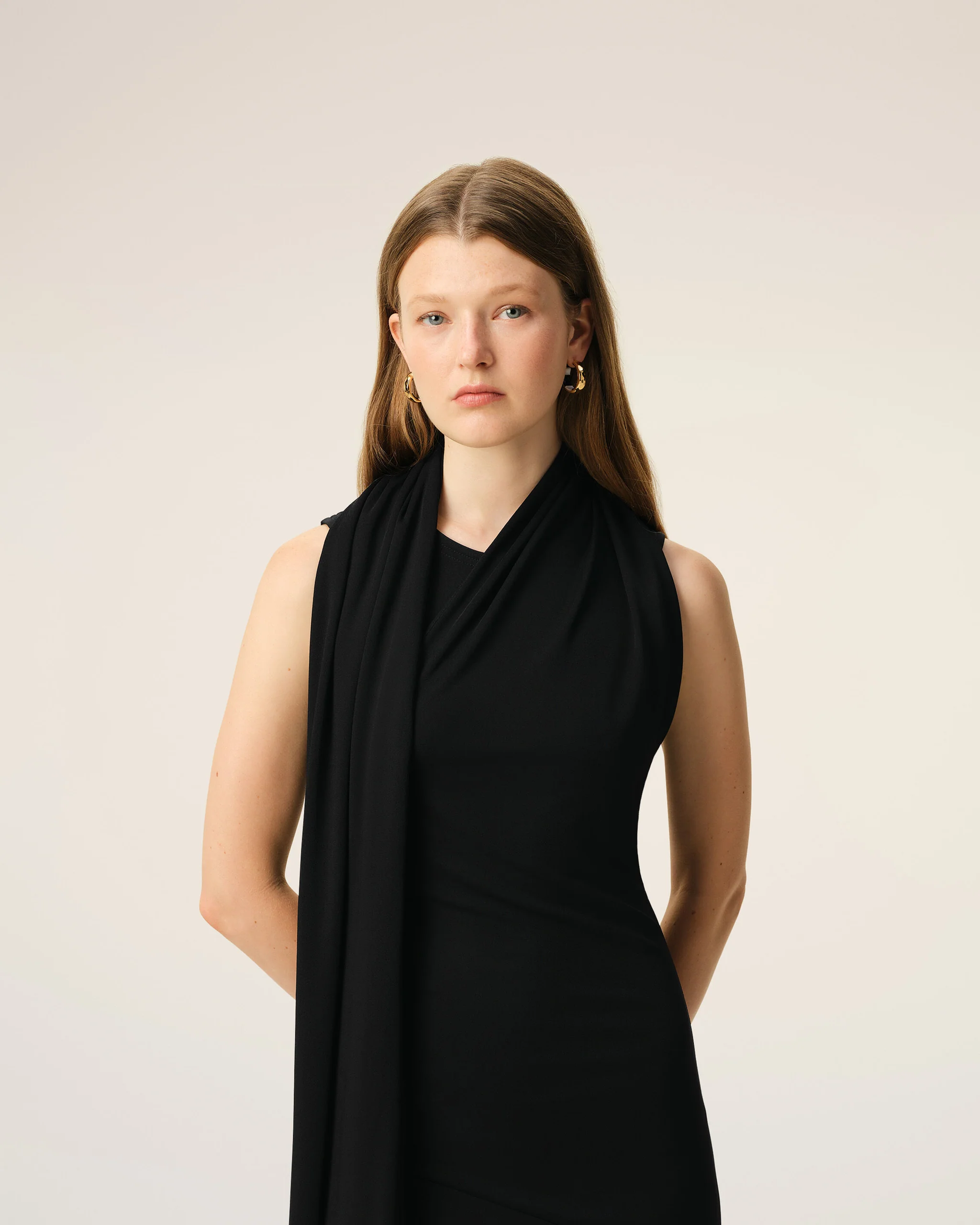 Long sleeveless lavaliere dress in crepe jersey.