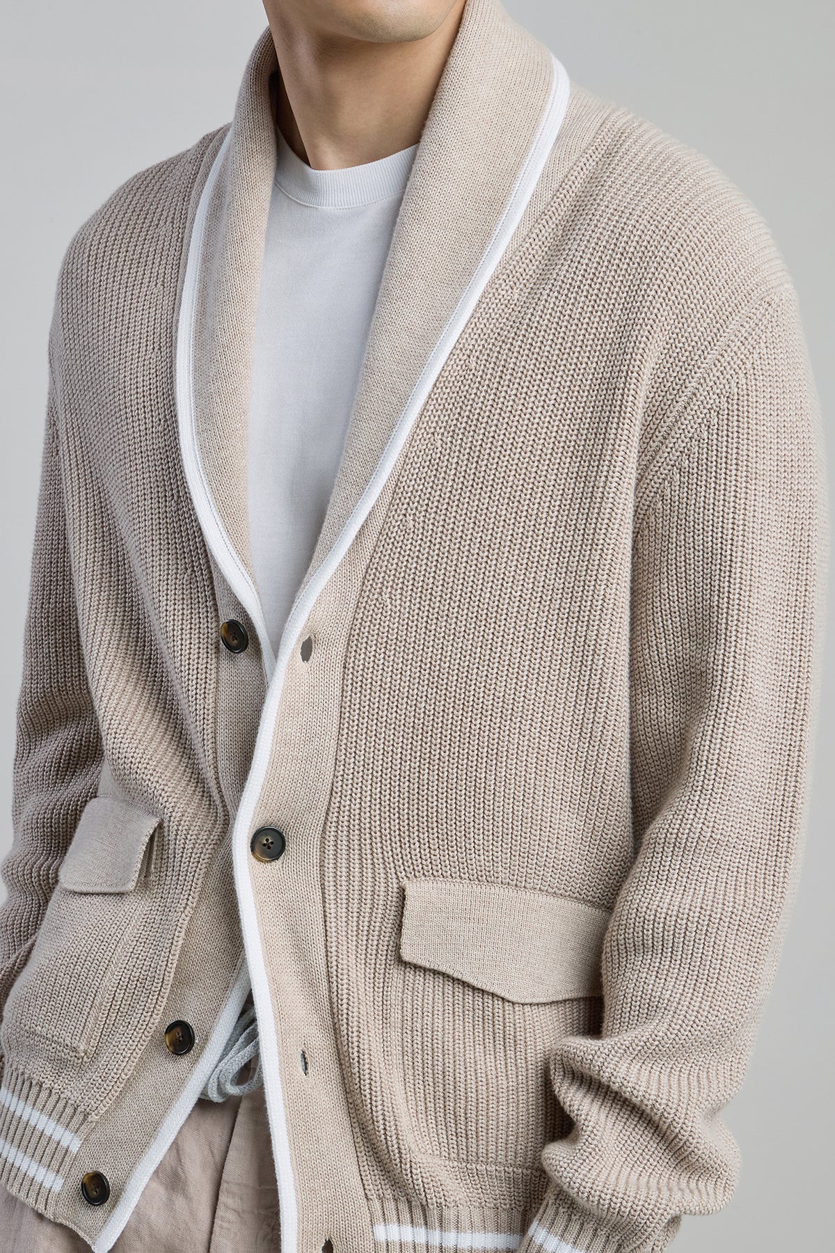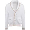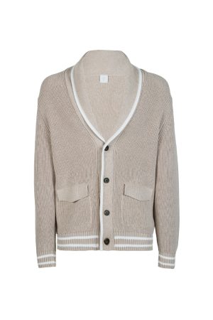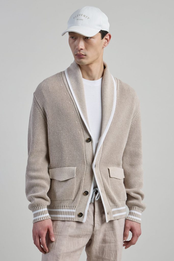 The tactile texture of English rib stitch defines this shawl collar cardigan, crafted from high-quality 5-gauge cotton for a refined yet relaxed look. This men’s knitwear piece features a sporty aesthetic, highlighted by contrasting white stripes on the cuffs and hem. Functional horn buttons add a classic touch to the contemporary silhouette, while the regular fit provides effortless layering possibilities. The use of cool cotton yarn ensures maximum breathability and comfort during transitional weather. Sophisticated and functional, this buttoned sweater represents a versatile staple for a modern wardrobe, blending traditional craftsmanship with athletic-inspired details.