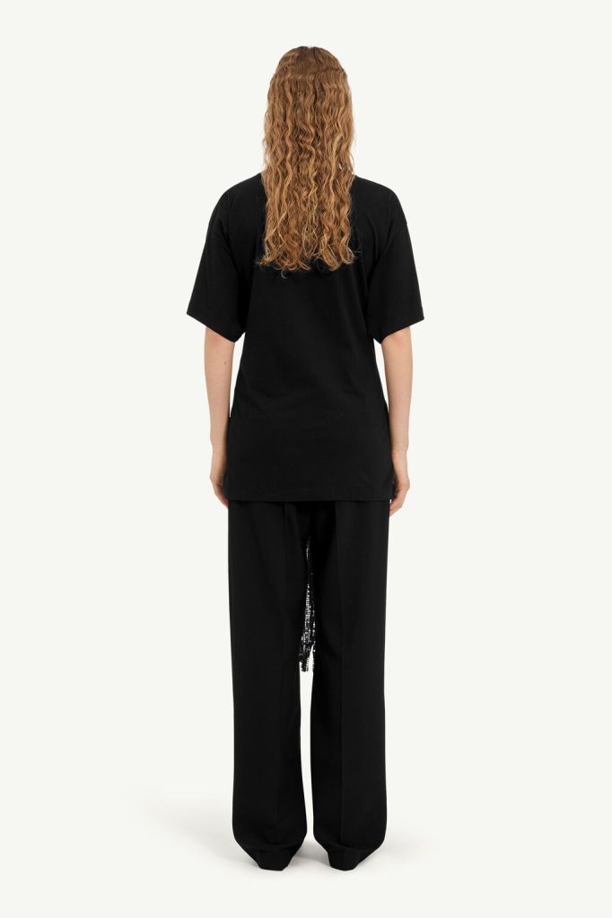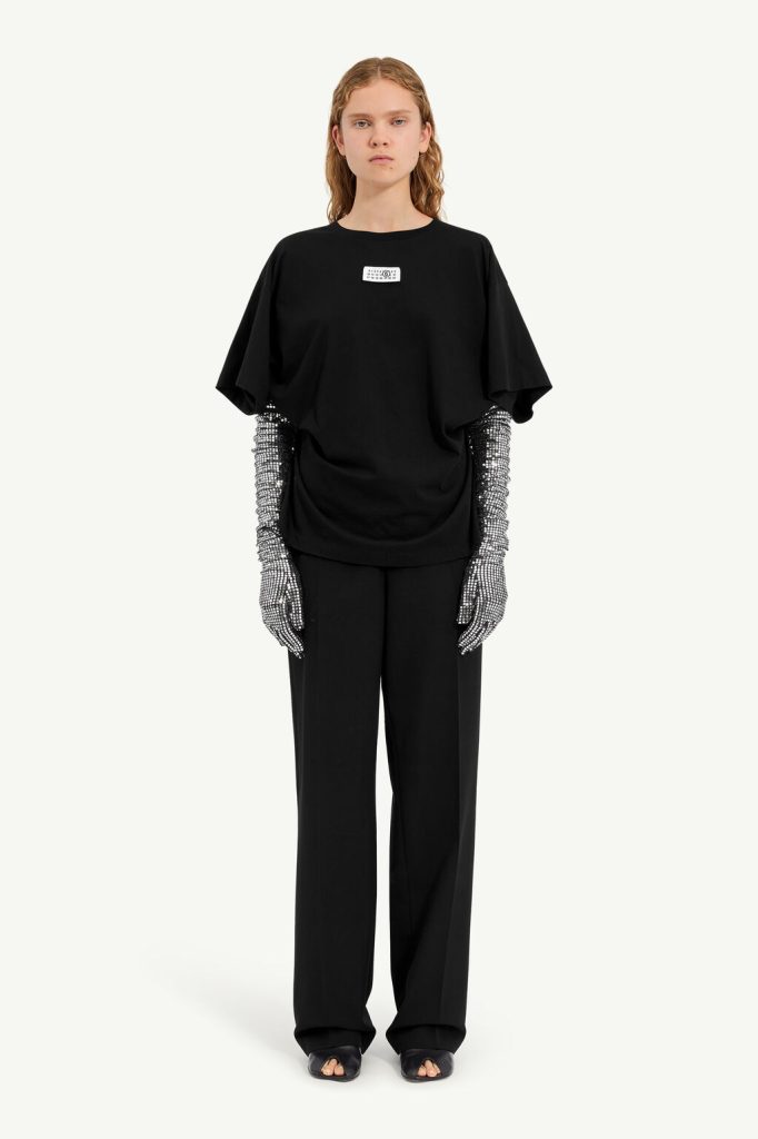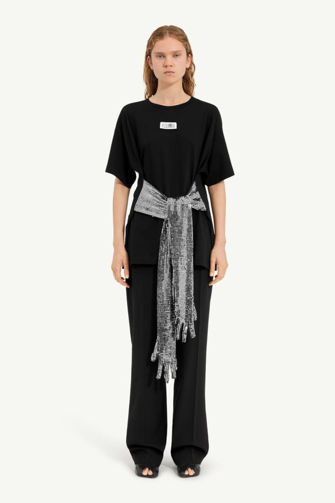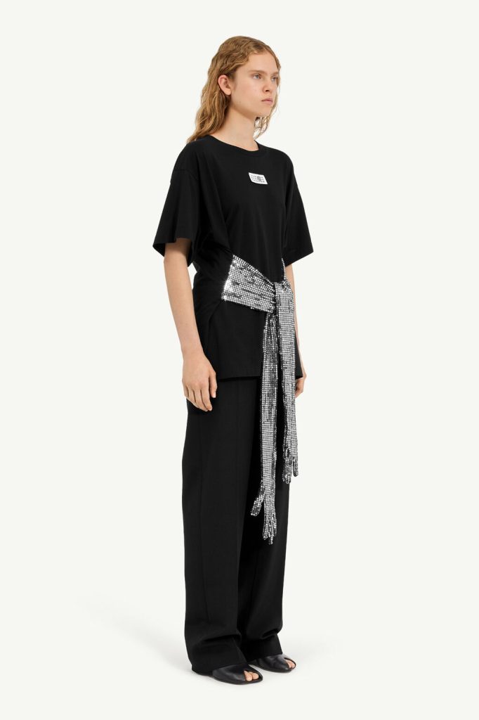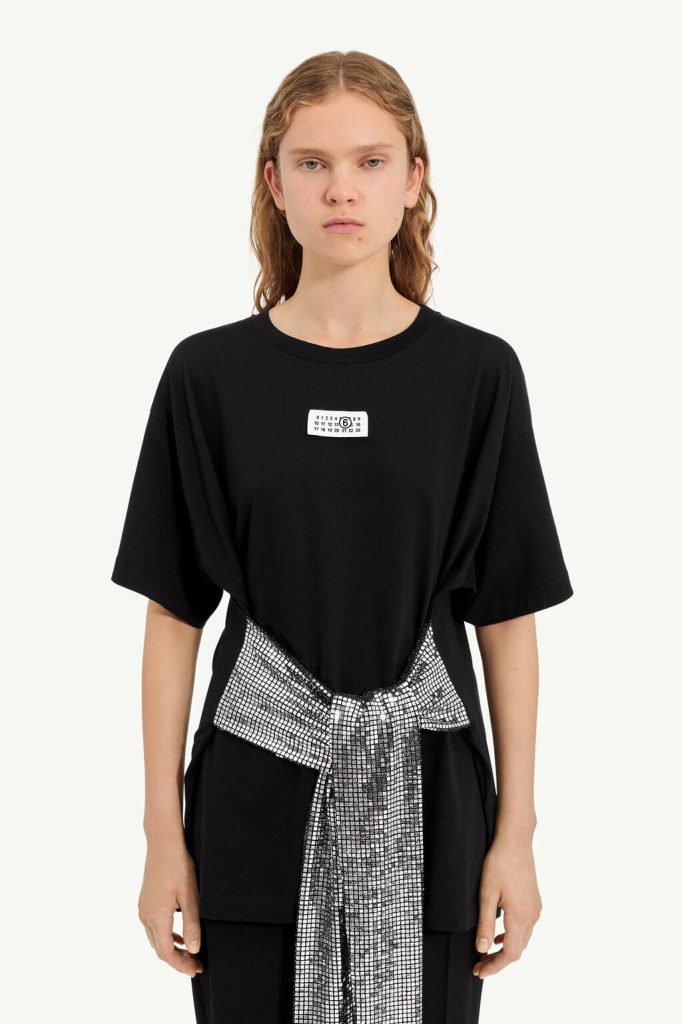 Crafted from soft cotton jersey, this T-shirt is redefined by silver sequin disco gloves threaded through the waist. They can be worn as ties to sculpt the silhouette or released to hang loose, altering proportion and function in a single gesture. At the back, the MM6 white stitch line asserts its signature.