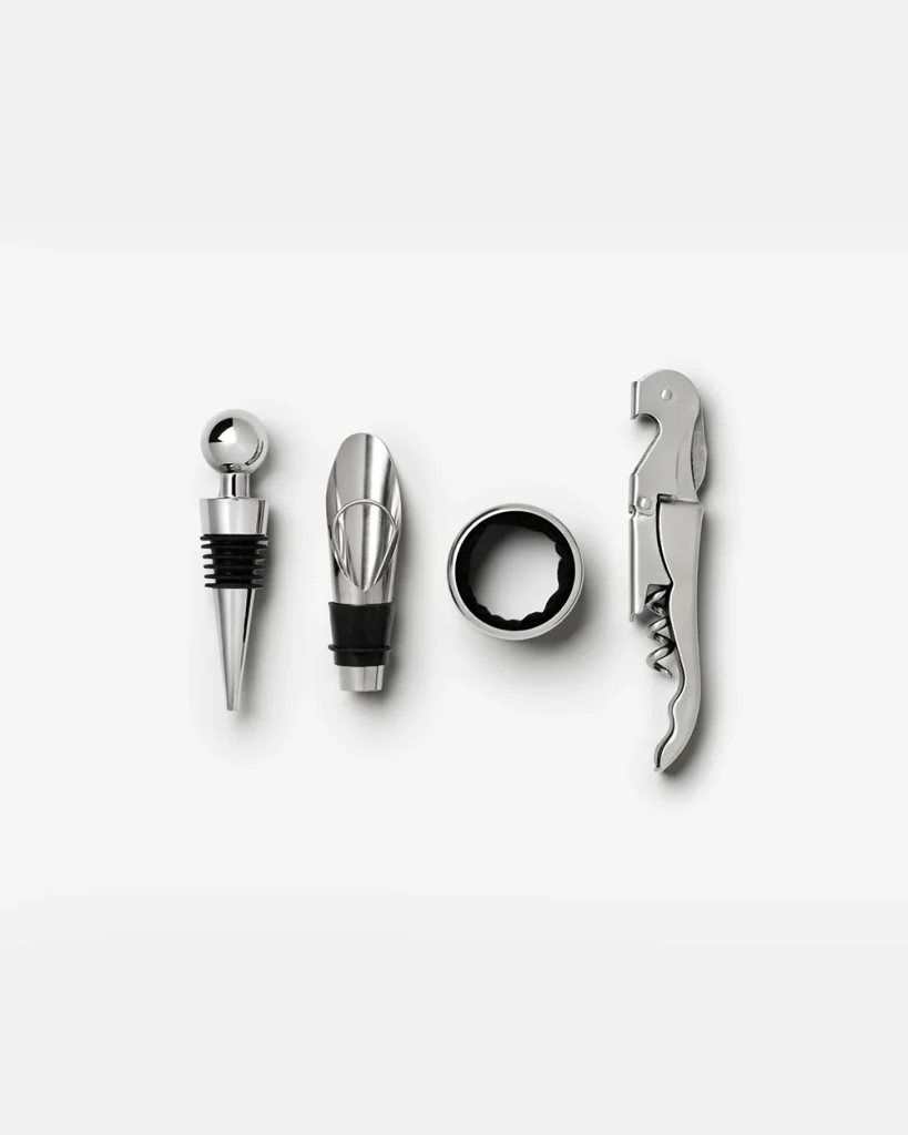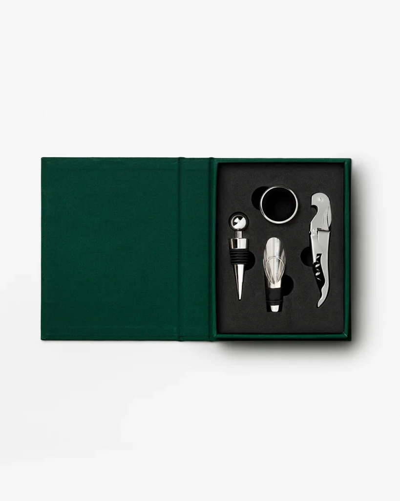 Discover the essential kit for perfecting your wine experience – a refined toolbox in an elegant book-like box that makes the perfect going-away gift. Inside, you’ll find an opener, stopper, pourer, and collar, each serving as essential tools in wine appreciation. All products are made of stainless steel and are dishwasher safe.