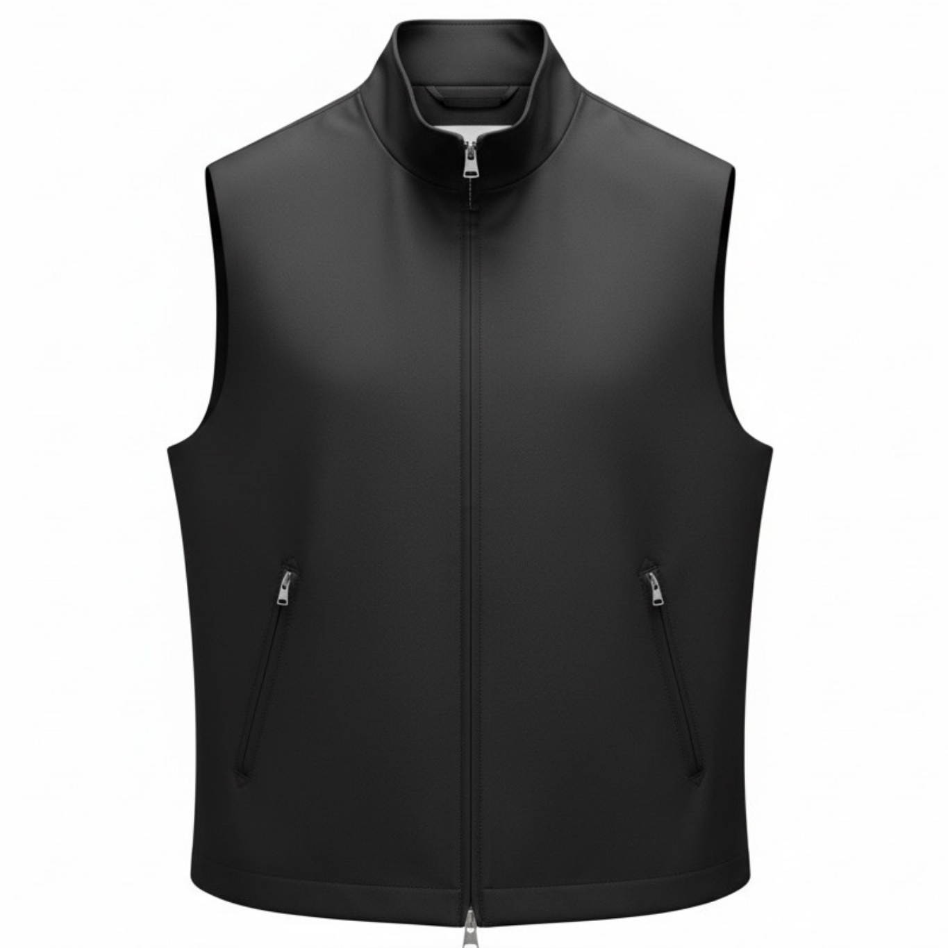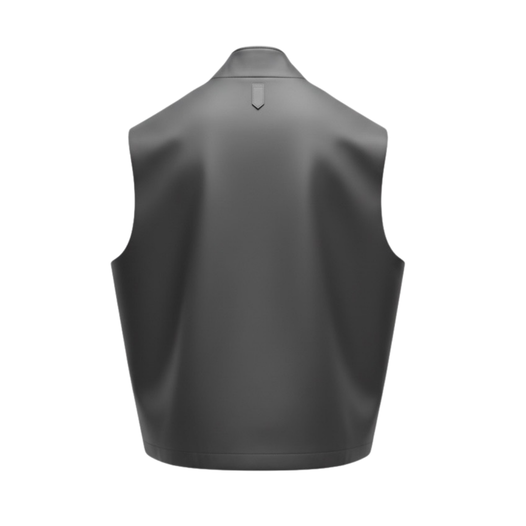 Contemporary design vest with mandarin-style collar, made of an innovative technical fabric that provides protection and lightness. Refined leather details enhance its finish and timeless style. Functional, elegant and versatile, it is designed to casually complete everyday looks, adding a note of dynamic distinction.